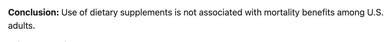 A thorough medical literature search revealed no papers whereby a link to daily supplement use resulted in deaths; in fact, the opposite was true. A 2019 paper titled “Association Among Dietary Supplement Use, Nutrient Intake, and Mortality Among U.S. Adults: A Cohort Study” published in the Ann Intern Med., documents that in over 30,000 people,