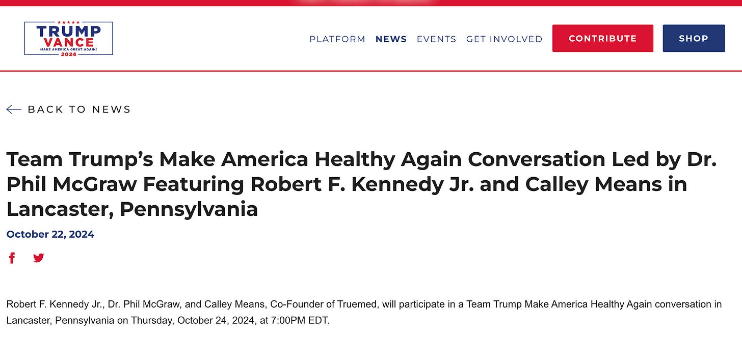 This growing revolt is, in part, prompted by the central role of Pharmaceutical Industry lobbyist Calley Means in the Trump HHS transition team process. Mr. Means’ relationship to President-elect Trump apparently preceded the recent election cycle, and to the best of my understanding it was Calley Means who brokered the “rapprochement” between then-Republican party candidate President Trump and independent candidate Robert F. Kennedy Jr.