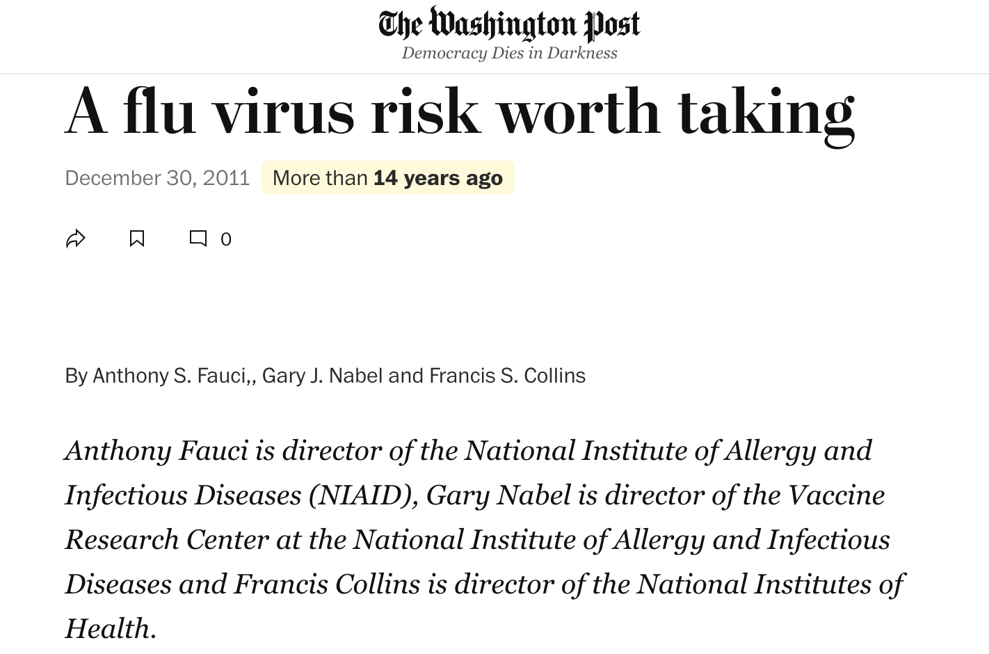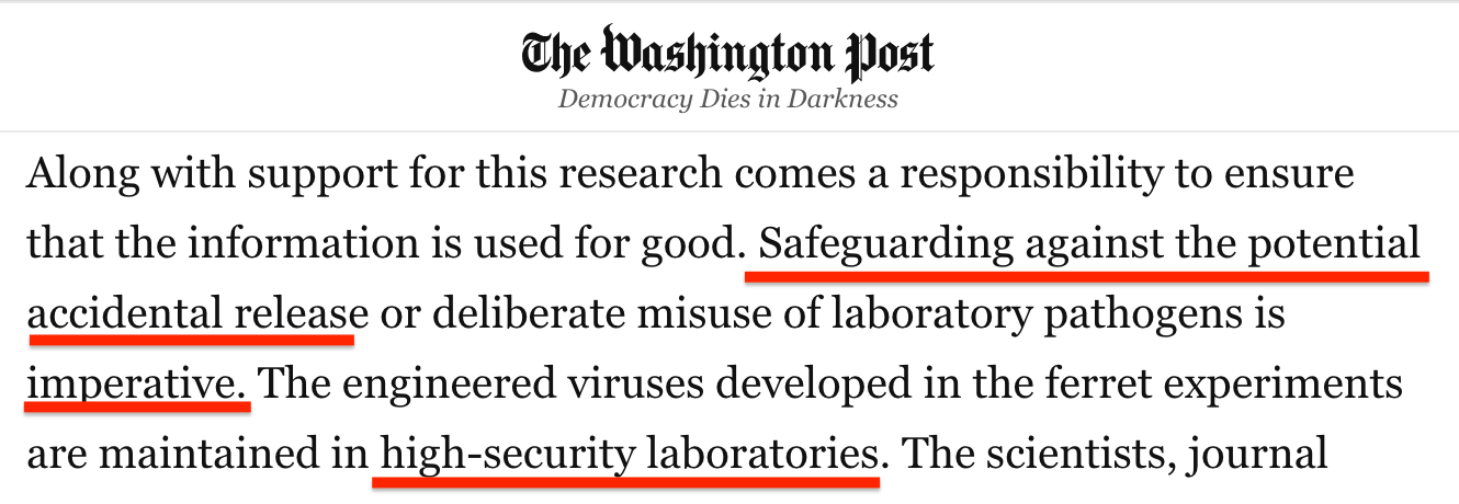 Finally, Wain-Hobson took NIH leaders to task for publishing a 2011 essay in the Washington Post titled, “A flu virus risk worth taking,” that curtailed debate around the dangers of virus research, at a time when the Fouchier/Kawaoka dangerous gain-of-function studies were being published. In their Washington Post essay, Collins, Nabel and Fauci stated that safeguarding against accidental release of dangerous viruses was “imperative” while assuring the public that these studies were taking place in “high-security laboratories.”