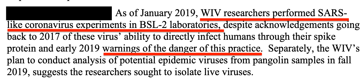 However, the Director of National Intelligence declassified a June 2023 report on the research conducted before the pandemic’s outbreak at the NIH-funded Wuhan Institute of Virology, concluding that dangerous gain-of-function studies were being conducted at BSL-2, a low level of biosafety, despite “warnings of the danger of this practice.”