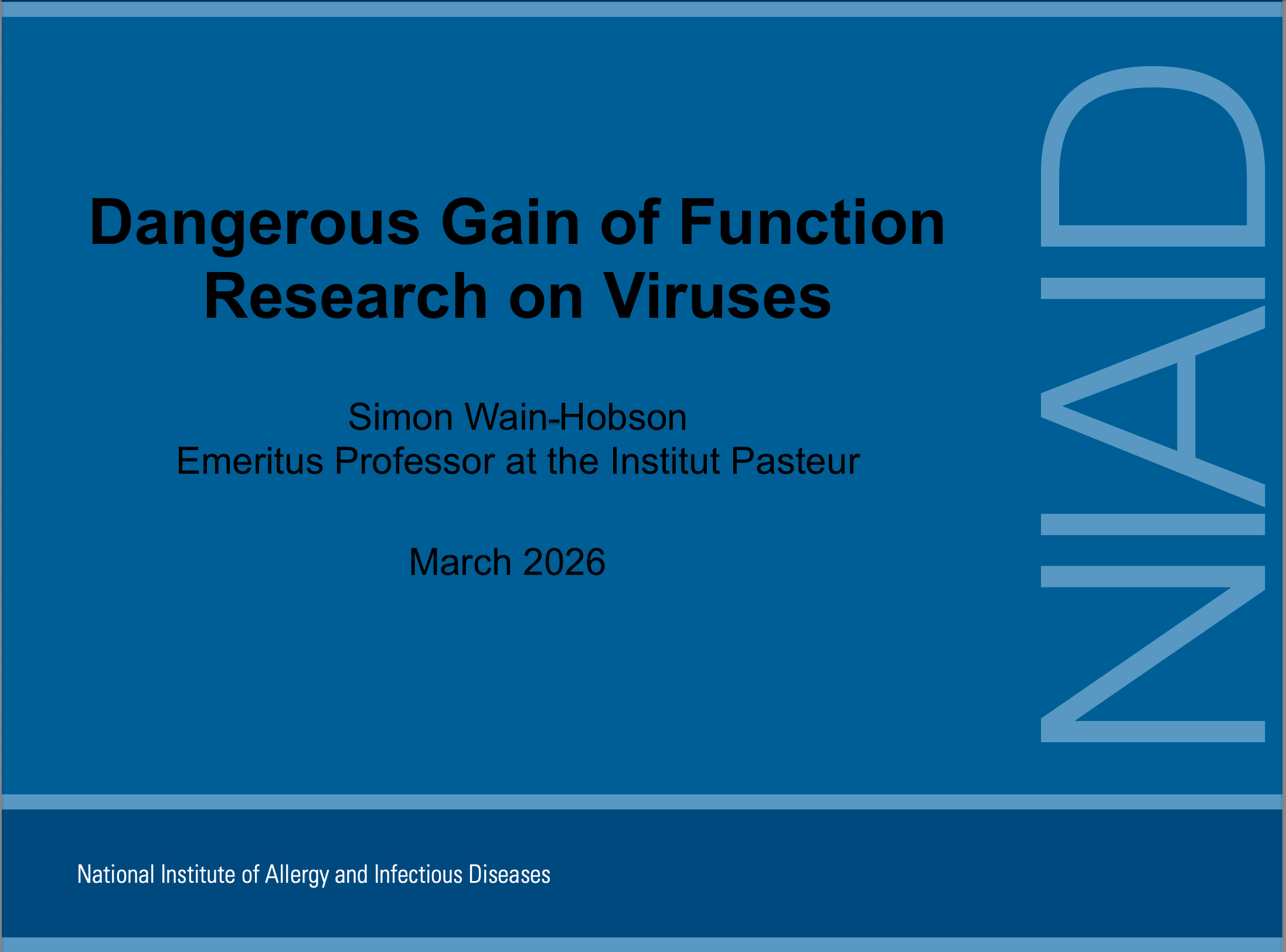 In his talk’s opening, Wain-Hobson called out the NIH and several scientists for obfuscating the meaning of gain-of-function research for well over a decade.