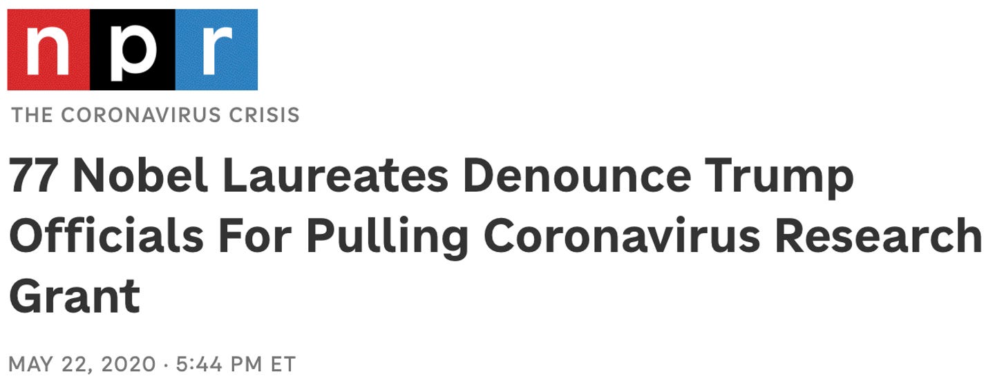 He cited the letter sent by Nobel Prize winners complaining when the NIH stopped a grant by Peter Daszak with EcoHealth Alliance. “The scientists cannot be egocentric and say, ‘We can override the safety and health of others.’”