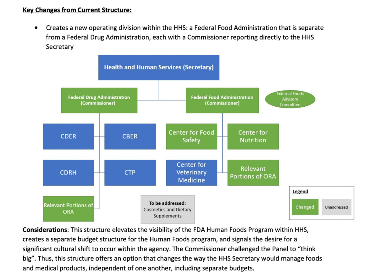 In a Reagan-Udall Foundation for the FDA report, published in 2023 titled: Operational Evaluation of the FDA Human Foods Program, is the basis for what the FDA calls a total reorganization of the FDA. In this report, the idea was floated of separating into two separate administrations under the Cabinet-level Director of Health and Human Services. The two programs were proposed to be named the Federal Drug Administration and the Federal Food Administration.