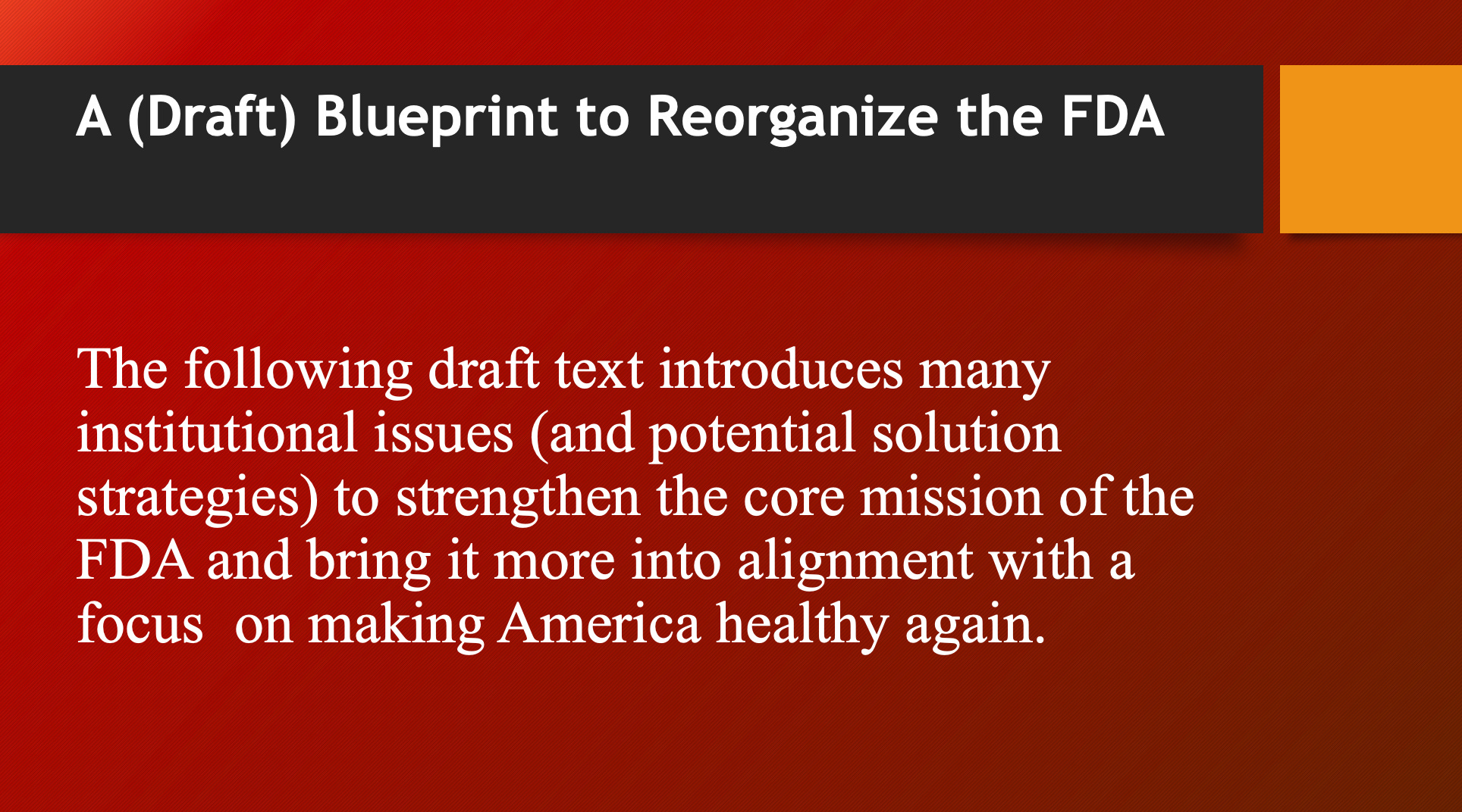 The following draft text introduces many institutional issues (and potential solution strategies) which may strengthen the core mission of the FDA and bring it more into alignment with a focus on making America healthy again.