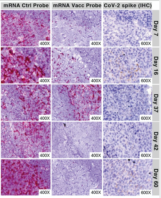This study asserts that the mRNA and the spike protein produced persists for weeks in lymph node germinal centers in human patients. Immunohistochemical staining for spike antigen in mRNA vaccinated patient LNs varied between individuals, but showed abundant spike protein in germinal centers 16 days post-2nd dose, with spike antigen still present as late as 60 days post-2nd dose. Having worked with mRNA for decades, I can attest that this is highly unusual.