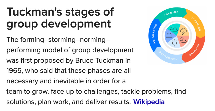Through the COVIDcrisis, we have discovered that our leaders in different agencies (not just in the US, but also in Canada and around the world) have been making some pretty ill-advised public health management decisions. Of course, as previously discussed, other issues are also at play here: regulatory capture, inverse totalitarianism, top-down (White House, Birx or Fauci) decision making, etc. But at the core, groupthink has come to dominate group decision making in the 21st century. I believe it is partially because of the widespread teaching of Tuckman's “stages of group development” has dominated governmental and corporate organizational training programs during the late 20th and early 21st centuries.