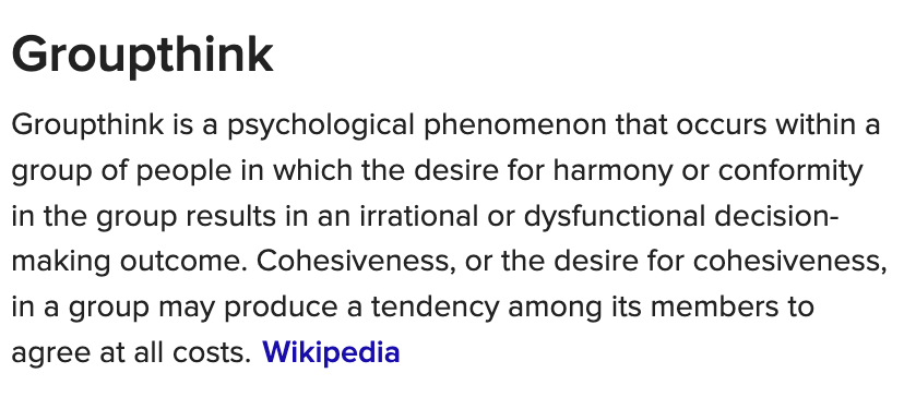 With this prelude, let’s consider something that has been on my mind a lot lately. There is a style of group decision making that leads to poor group decisions, ergo: groupthink, that has come to dominate management practices in both government and large businesses. Why is that happening?