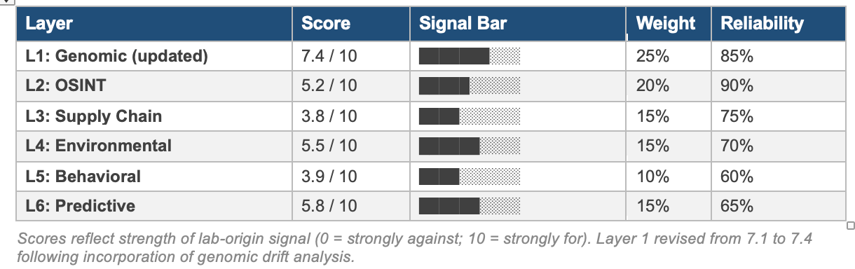 The incorporation of genomic drift analysis raised the Layer 1 score from 7.1 to 7.4, producing a posterior revision of +0.4 percentage points (24.2% → 24.6%). This modest revision reflects an important structural feature of the Bayesian framework: with power dampening applied and strong negative signals in Layers 3 and 5, additional positive signal in Layer 1 produces diminishing returns on the posterior. The drift analysis deepens the anomaly but does not resolve the attribution problem; the posterior will shift substantially only when corroborating evidence becomes available in the supply chain, behavioral, or institutional layers.