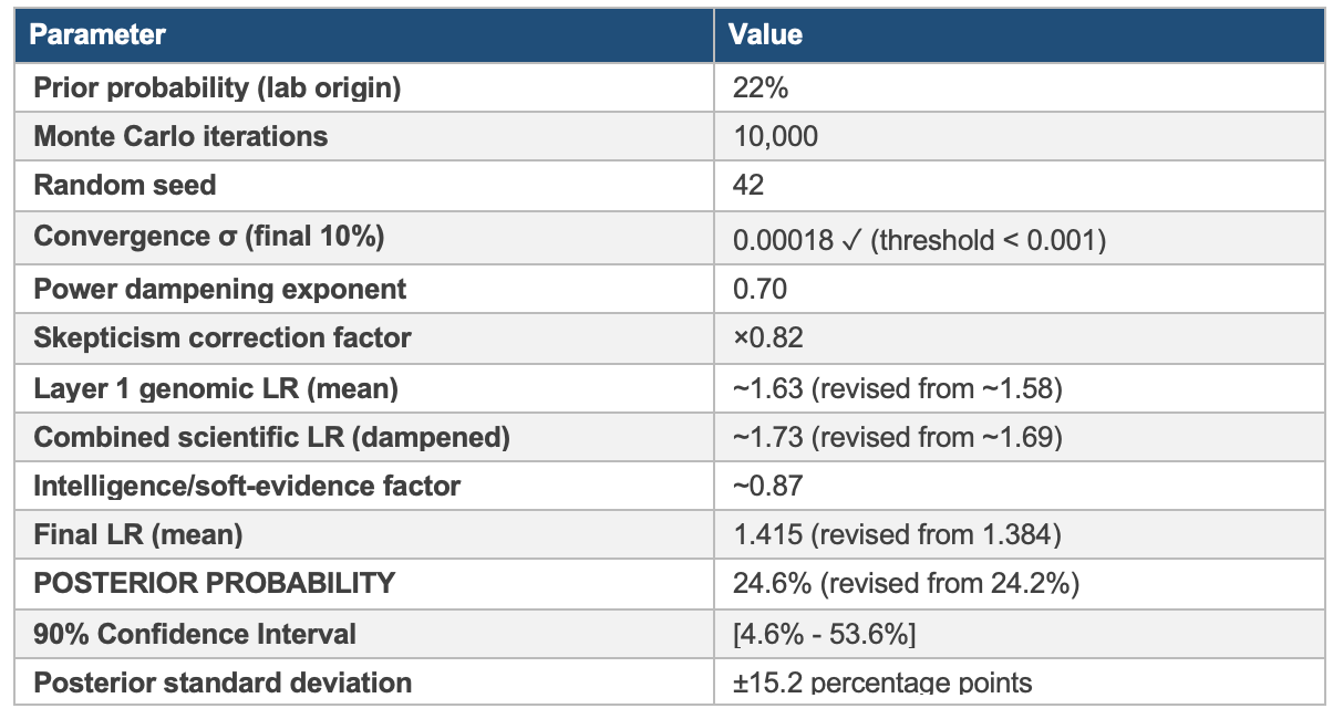 The Bayesian Monte Carlo integration of all six layers yields a posterior laboratory origin probability of 24.6% (90% CI: 4.6%-53.6%), representing a modest upward revision from the pre-drift-analysis estimate of 24.2%. The wide confidence interval reflects genuine evidentiary uncertainty, not analytical imprecision. The genomic drift data strengthens the anomaly signal in Layer 1 but does not resolve the absence of corroborating evidence in Layers 3 and 5.
