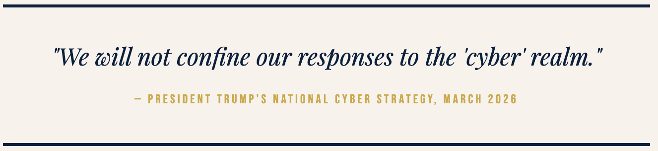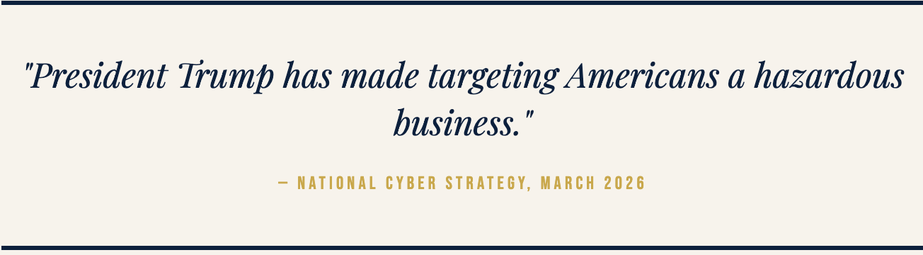 The full text of President Trump’s Cyber Strategy for America was released by the White House in March 2026. Readers are encouraged to review the primary document.