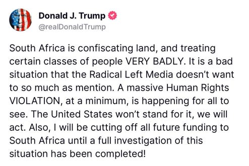 Seemingly out of the blue, Trump fired off a Truth Social Post and has come out against this annihilation of the South African farmer in a way no other Western leader has had the guts to do. With Elon Musk at his side, and surrounded by several other South African friends and businessmen like Gary Player the famous South African golfer, Trump has thrown the gauntlet down against the ruling regime in South Africa and decided to withhold foreign aid. In short order Secretary of State Marco Rubio declared that the US will not attend the G20 summit in South Africa. Then this week, South Africa’’s ambassador to the US insinuated that Trump was a white supremacist. Rubio promptly threw the ambassador out of the USA.