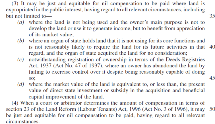 The instances where it may be just and equitable for the State to pay ‘nil’ compensation are quite controversial, especially subsection(a) “where the land is not being used and the owner’s main purpose is not to develop the land or use it to generate income but to benefit from appreciation of its market value” (in other words for speculative purposes). Perhaps the principle of “use it or lose it” seems to be the best protection against this. Several concerns immediately arise, though. Who will determine this and what will happen to land that is used, for example, for conservation purposes and cannot be and should not developed for a valid reason? The wording is broad which leaves it open to the State’s discretion.