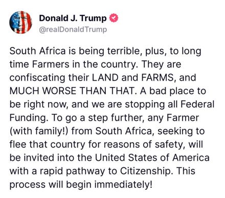 When the ANC failed to maintain their two-thirds majority in the 2024 election and had to align with the Democratic Alliance to stay in power, it was v a shot across their bows that their rule was vulnerable. I believe this is why they accelerated their “Revolution”. This parallels with Zimbabwe. When Mugabe’s power weakened with the rise of the Movement for Democratic Change under Morgan Tsvangirai in 2000, Mugabe commenced total war on Zimbabwe’s white farmers. Hundreds of land invasions destroyed the “bread basket” of the continent. Highly productive agricultural land was seized violently and handed out to ZANU-PF supporters who, knowing nothing of farming, let the land fall into ruin.