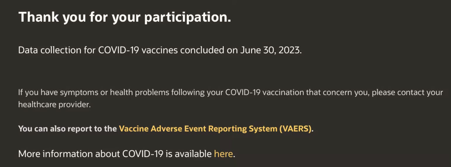 The Centers for Disease Control and Prevention (CDC) V-safe website quietly stopped collecting adverse event reports with no reason or explanation. The V-safe website simply states: “Thank you for your participation. Data collection for COVID-19 vaccines concluded on June 30, 2023.” If you go there today, V-safe directs users to the FDA’s VAERS website for adverse event reporting, even though officials continually derided VAERS as “passive” and “unverified.”