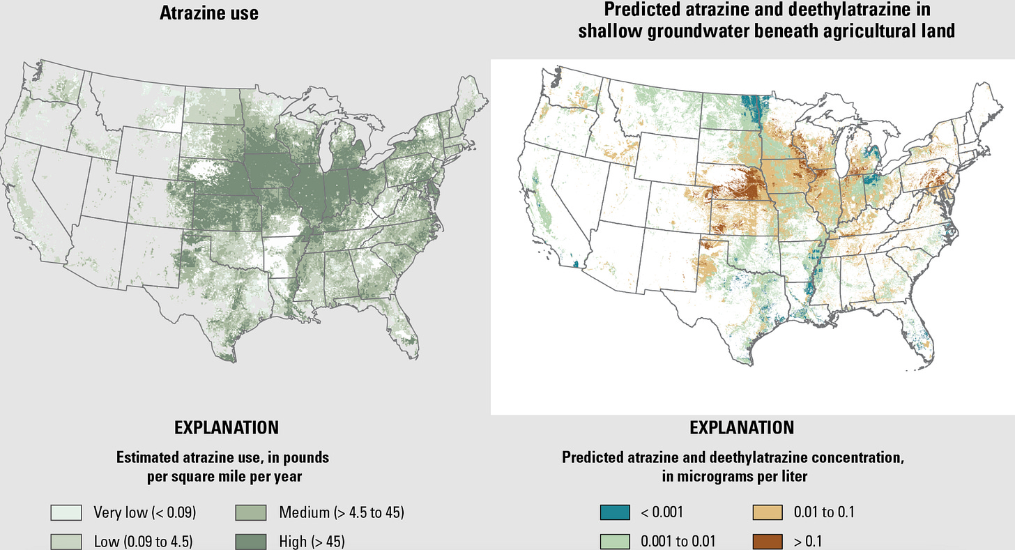 In the United States, farmers just keep on spraying atrazine, with more than 70 million pounds used each year on just three crops: corn, sorghum, and sugarcane. As shown below, in vast areas of the United States, the application of atrazine is equal to or exceeds 45 pounds per square mile.