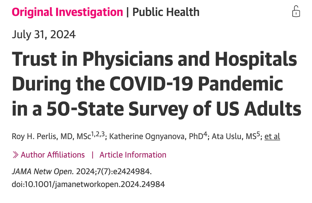 Despite these caveats, this multiwave nationally representative survey identifies a substantial decrease in trust in physicians and hospitals during the COVID-19 pandemic and demonstrates associations between trust and health-related behavior after accounting for a host of potential confounding variables. Whether interventions to restore trust could increase compliance with vaccination and other positive health behaviors merits further investigation. In particular, our analyses of open-ended results suggest that factors associated with mistrust are heterogeneous, which may require more targeted interventions.