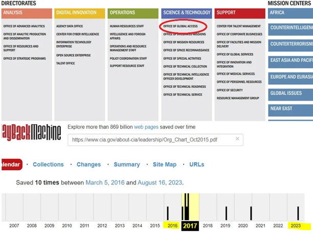 The OGA is one of the 56 offices in the CIA, with its chief and deputy making up two of a total of 286 director-level officials in the spy agency. An unclassified org chart published by the CIA (photo below and a chart from 2011 [https://nsarchive2.gwu.edu/NSAEBB/NSAEBB438/docs/doc_63.pdf ]) lists the OGA among nine offices in the “Science and Technology” wing of the agency.