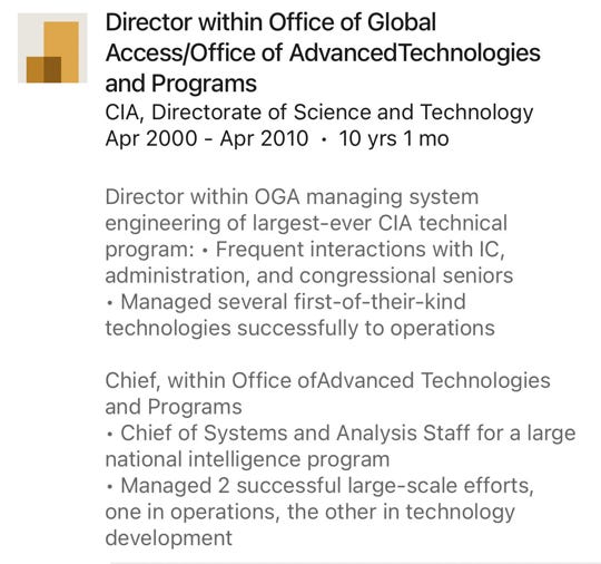 Mark Moynihan, another employee with the OGA populated his LinkedIn profile with the following: