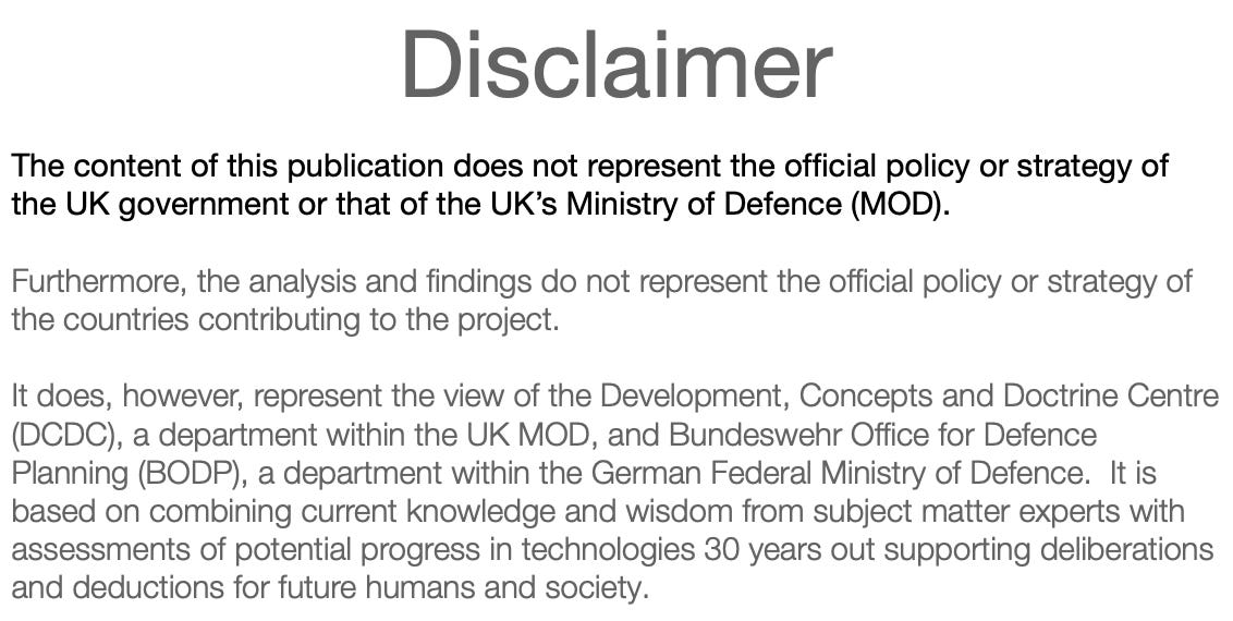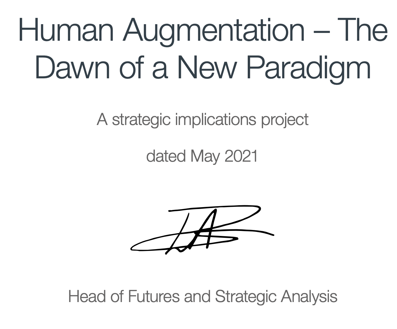 In the non-classified report from the UK Department of Defense, together with the Germany Office for Defence Planning , the report discusses the ethics of human augmentation
