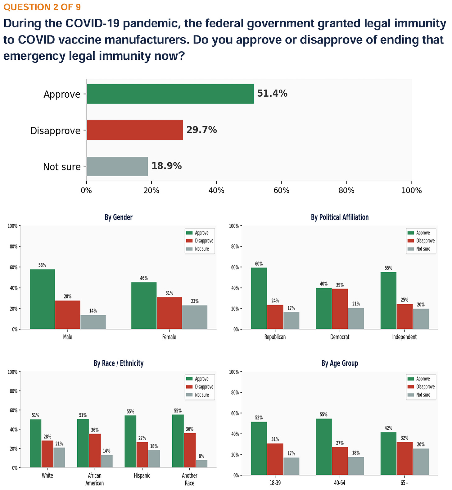 ANALYSIS: A majority (51.4%) approve of ending COVID vaccine manufacturer immunity, with 29.7% opposed and 18.9% unsure — the highest undecided rate of any question. Men approve at 58.2% compared to 45.6% for women. Approval is consistent across racial groups, ranging from 50.6% (White) to 55.4% (Another Race). By party, Republicans (59.6%) and Independents (55.4%) both favor ending immunity, while Democrats are more closely divided at 40.2% approve vs. 39.2% disapprove. Voters 65+ show the most uncertainty at 25.9%.