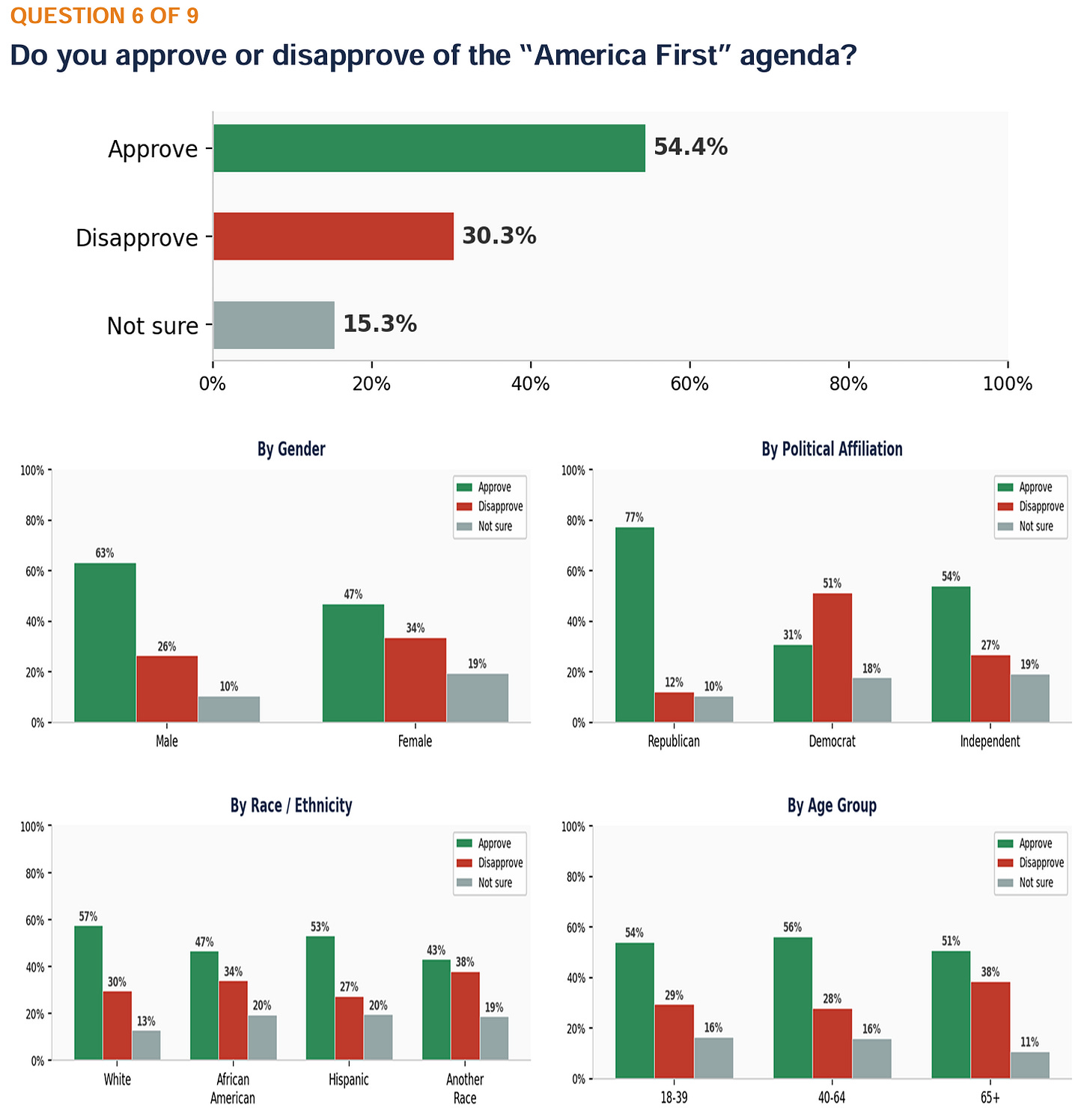 ANALYSIS: “America First” receives majority approval at 54.4%, with 30.3% disapproving and 15.3% unsure. All racial groups show plurality approval, led by White voters (57.4%) and Hispanics (53.0%). African Americans approve at 46.6% with 33.9% disapproving. Men approve at 63.2% compared to 46.9% for women. Republicans approve at 77.4%, Independents at 54.0%, and Democrats disapprove at 51.4% while 30.9% of Democrats approve.