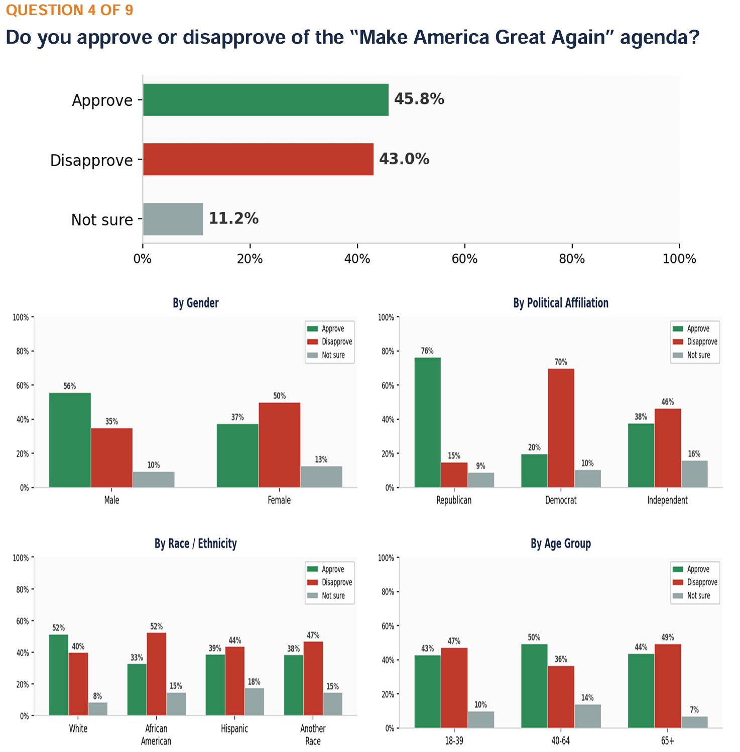 ANALYSIS: The MAGA agenda produces a near-even national split: 45.8% approve (the majority) vs. 43.0% disapprove, with only 11.2% unsure. There is a notable gender difference: men approve at 55.6% while women disapprove at 49.9%. White voters approve at 51.5%, while African Americans (52.4%), Hispanics (43.8%), and voters of Another Race (47.0%) lean disapprove. By party, 76.4% of Republicans approve, 69.8% of Democrats disapprove, and Independents lean disapprove 46.4% to 37.7%.