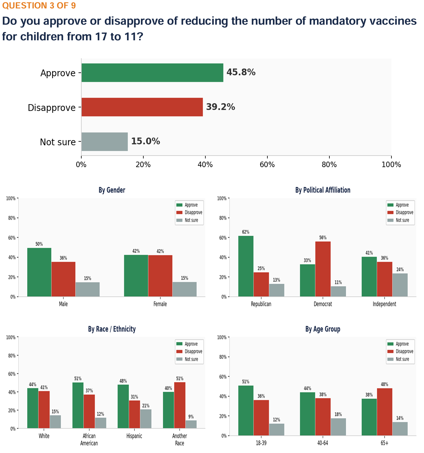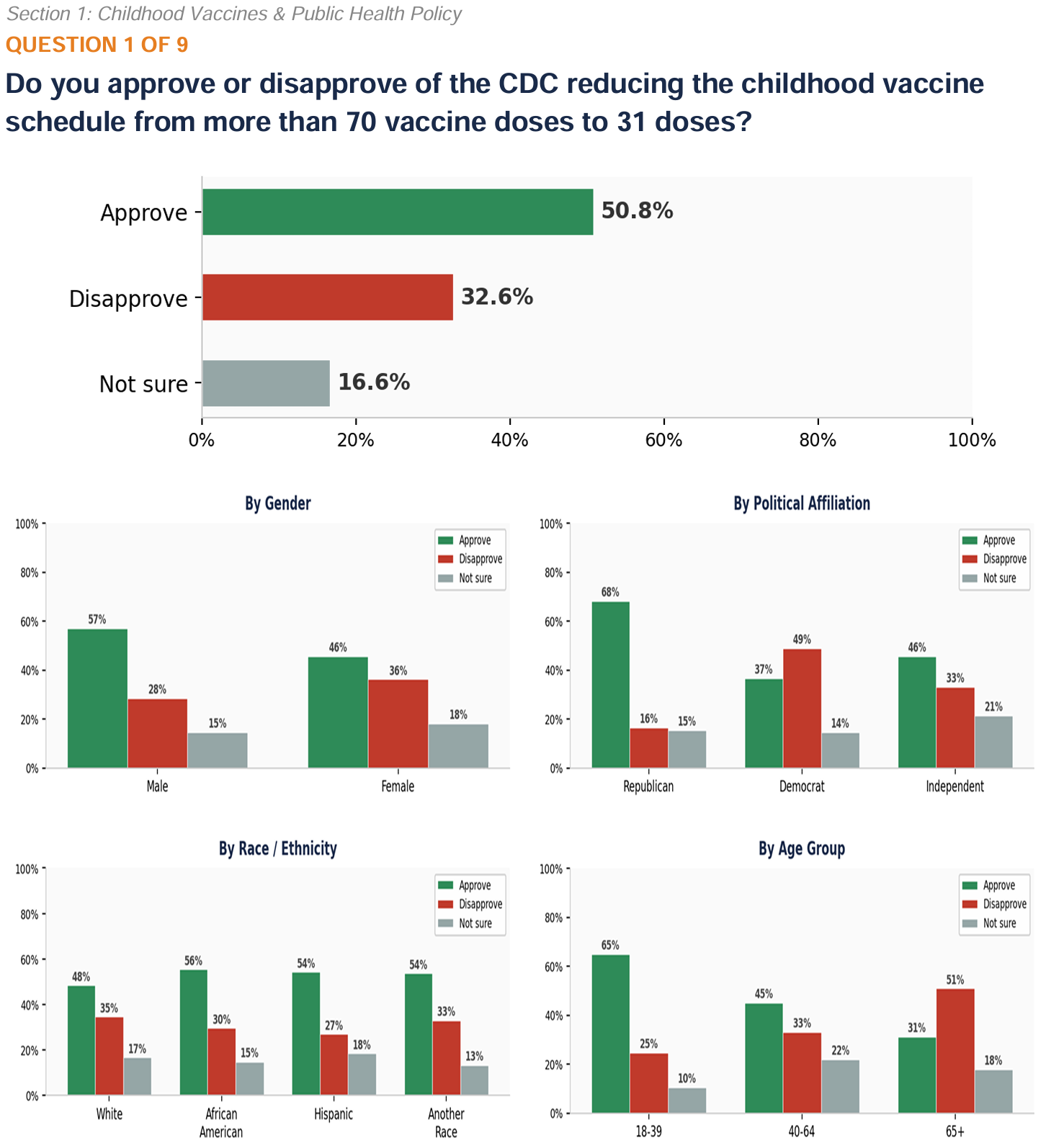 ANALYSIS: A majority of voters (50.8%) approve of reducing the childhood vaccine schedule, while 32.6% disapprove and 16.6% are unsure. Approval is higher among men (56.9%) than women (45.6%). Bu age, 18-39-year-olds show the highest approval (64.9%) while voters 65+ show the highest disapproval (50.9%). By race, African Americans (55.5%) and Hispanics (54.4%) approve at higher rates than White voters (48.5%). Republicans approve at 68.1%. Democrats approve at 48.9%, and Independents approve at 45.5%.