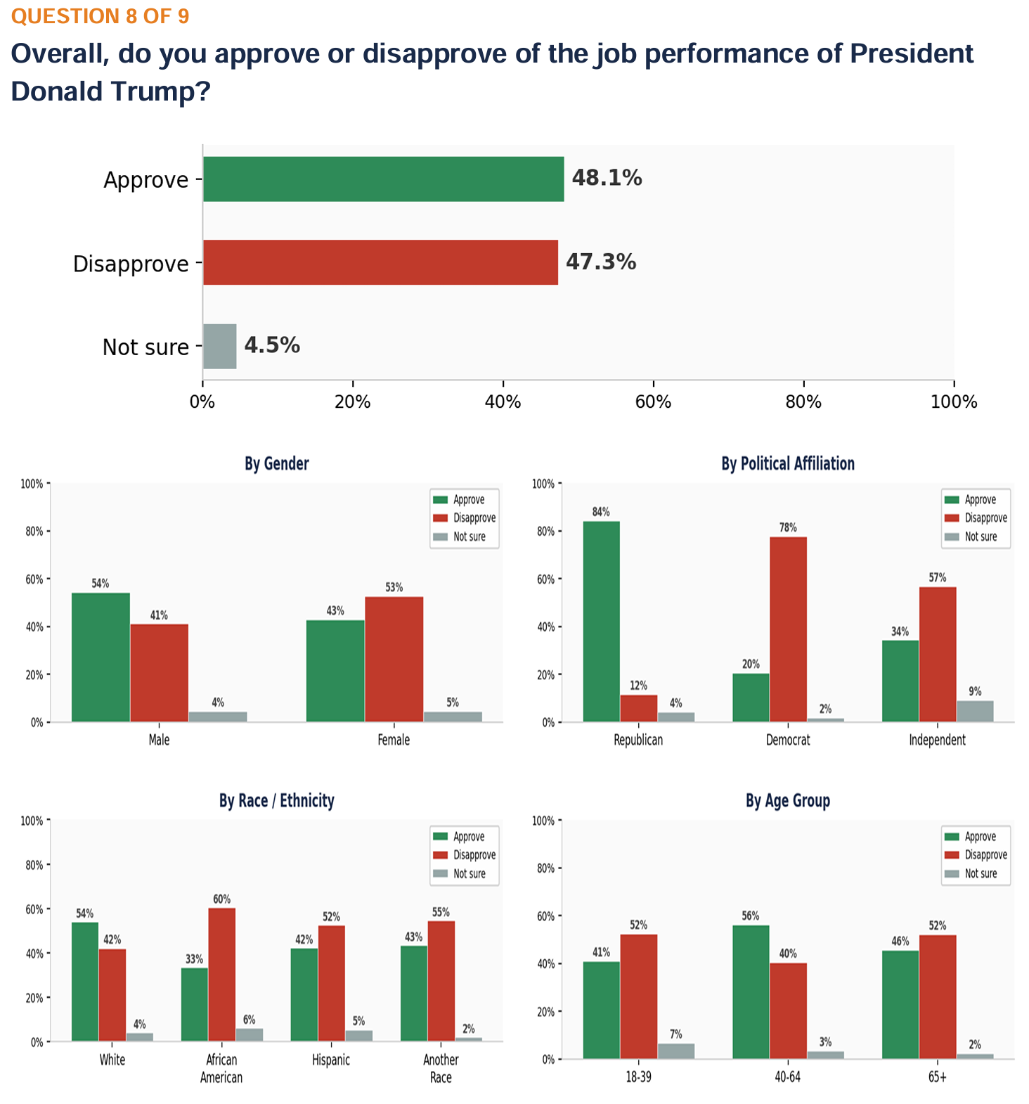 ANALYSIS: A majority - 45.8% approve vs. 39.2% disapprove, with 15.0% unsure. Women are nearly evenly divided (42.5% approve vs. 42.3% disapprove). By race, African Americans show the highest approval (50.6%) while “Another Race” shows the highest disapproval (50.7%). Voters 65+ disapprove at 48.3%. The partisan divide is wide: 61.8% of Republicans approve while 56.2% of Democrats disapprove. Independents show the highest uncertainty at 23.8%.