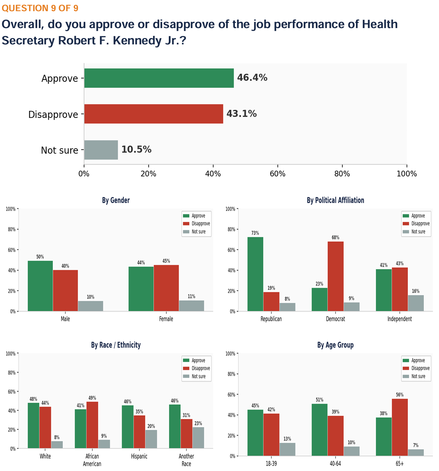 ANALYSIS: RFK Jr.’s job approval is 46.4% approve vs. 43.1% disapprove, with 10.5% unsure. White voters approve at 48.0%, African Americans disapprove at 49.2%, and Hispanics approve at 45.6%, with notable uncertainty (19.6%). “Another Race” voters also show high uncertainty (22.6%). Voters 40–64 show the highest approval (51.0%), while voters 65+ show the highest disapproval (55.8%). Republicans approve at 72.6%, Democrats disapprove at 68.1%, and Independents are closely divided (41.3% approve vs. 42.8% disapprove).