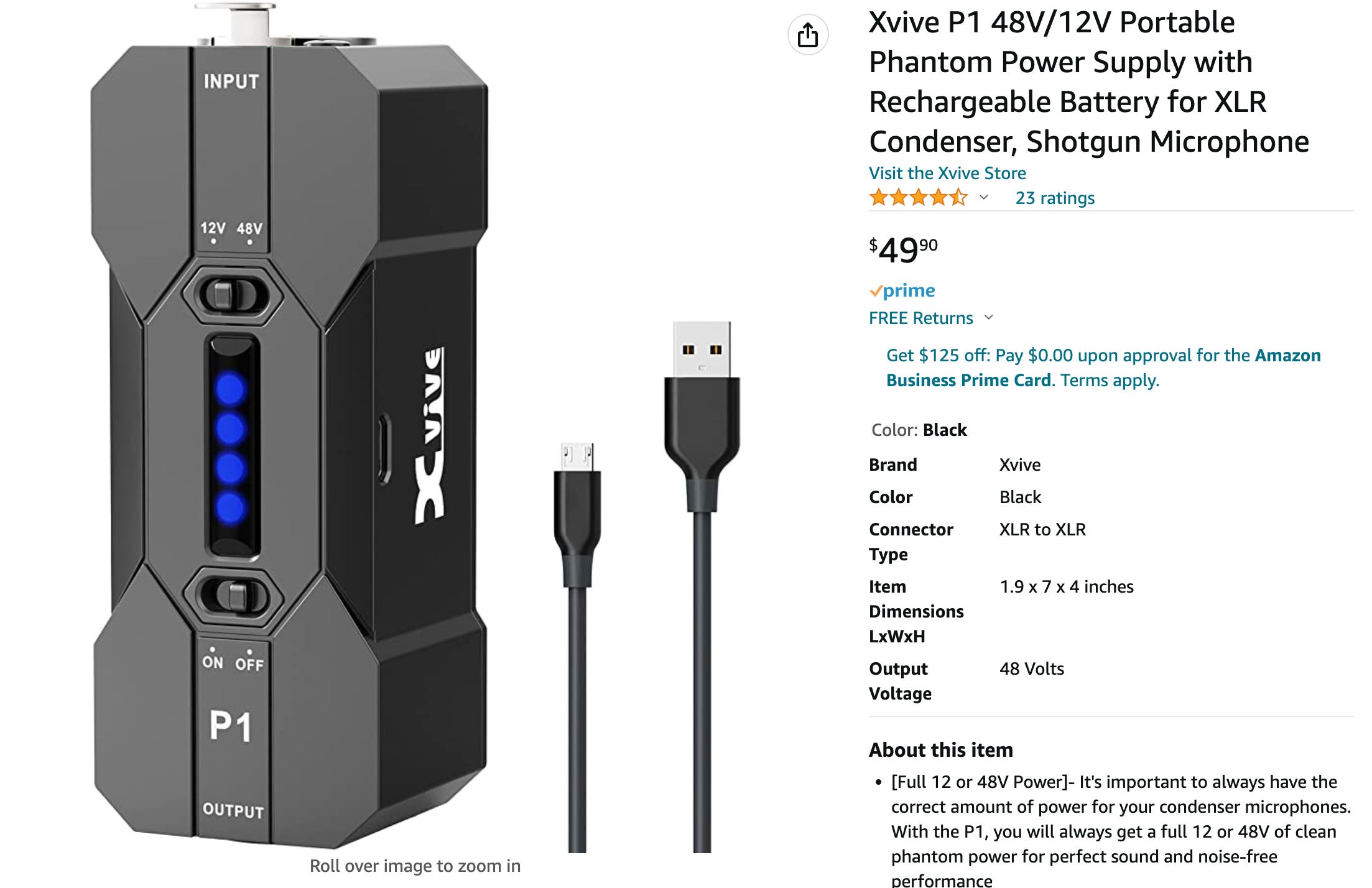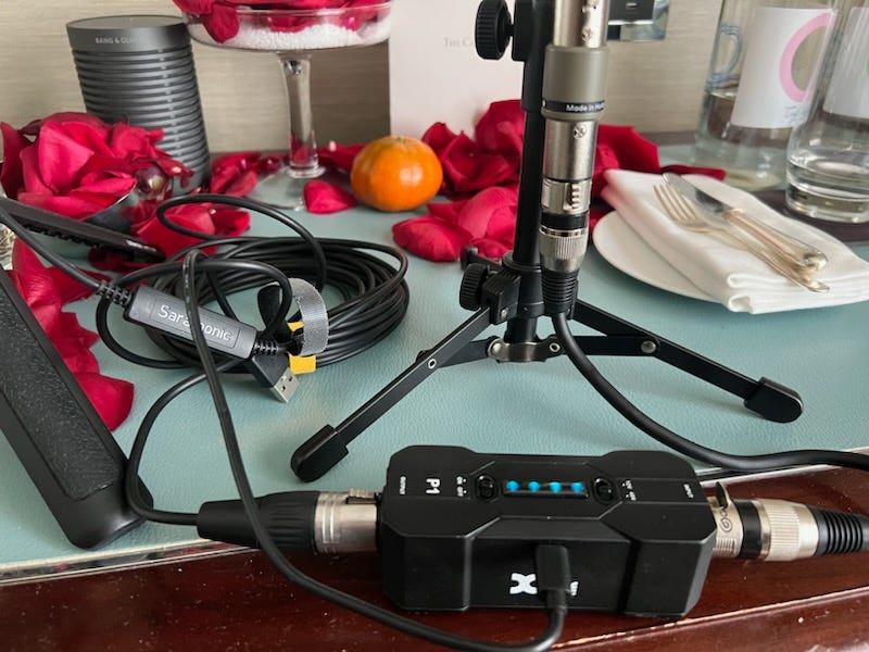 Now we have the mic, but how are we going to provide portable “phantom power”? Not many solutions available for that, but this neat little device fills the bill. It has its own built in battery which can be recharged from any USB power supply/brick. After plugging it into the system, you need to switch to 48V and turn it on. The LED lights let you know when you are getting to the end of your remaining power, but frankly I have never run out of power during any podcast or Twitter spaces broadcast.