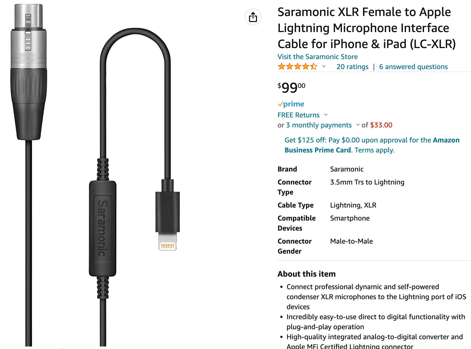 Then the question arises how do you go from XLR cable (and power supply connection) to your cell phone/I phone? This is the only solution I have found. It has way, way too much cable, but it seems to work flawlessly, and I just keep the extra coiled up with a keeper. A lot of money for a cable, but I could not find any other options that would do the trick. And I have had absolutely no trouble with this one, so there is that modest condolence.