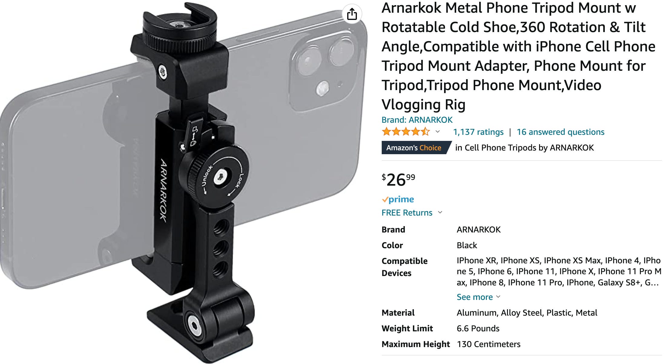 The advantage of this little kit is that it easily fits into a typical backpack, weighs almost nothing, and you can set it up almost anywhere. You have to set the cell phone on “speakerphone” unless you add a pair of headphones or an earpiece. but on the positive side that can free you up from having to be tethered to the cell by a wire. The best solution seems to be to use a pair of wireless earbuds like the Apple Air Pods, which readily pair with most cell phones and provide a bit more security when you are in a public space. I have purchased all of this from Amazon, and will use clips from that site for illustration purposes, but this essay is not sponsored and I am not endorsing Amazon in any way.