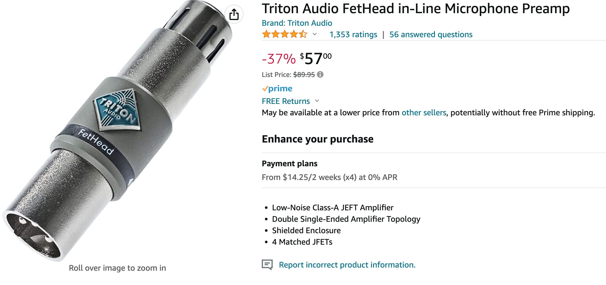 Next we have the preamp. Not all mics require one, but the SM7b seems to need a bit more punch. Most preamps are pretty bulky, but this little gem does the trick for this mini-rig. Note that it is plugged in between the mic and the power supply, inline, using the built-in male and female XLR cable connectors. Comes with a nice little travel bag.