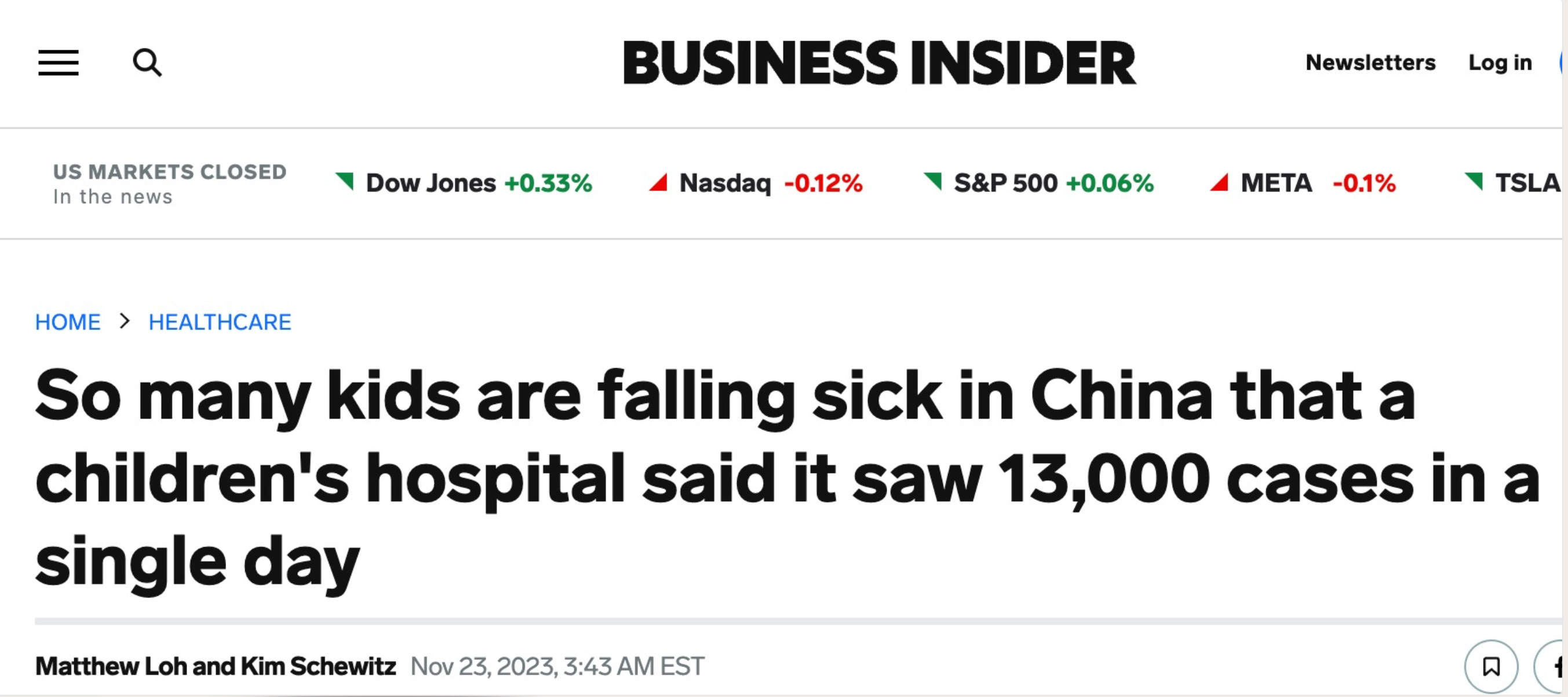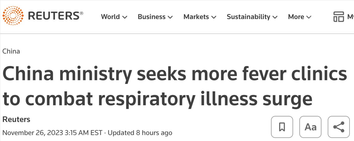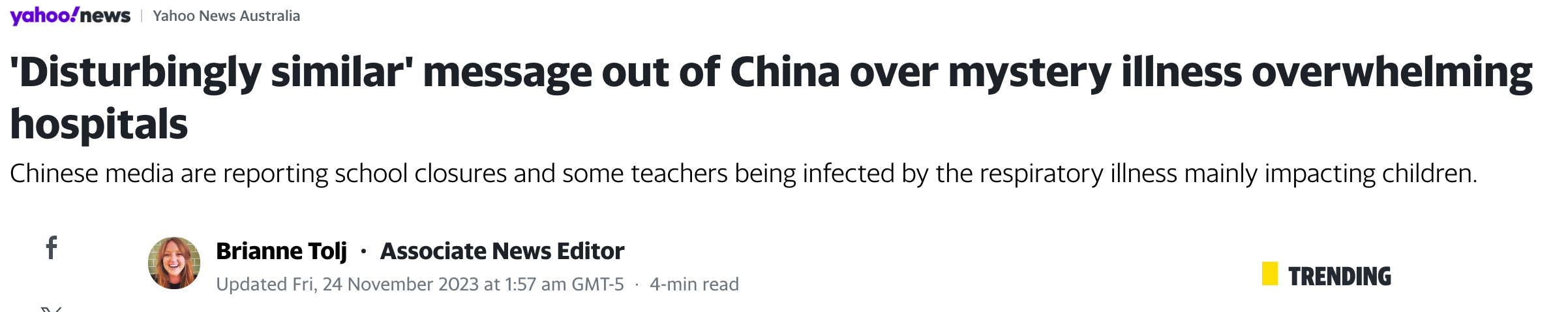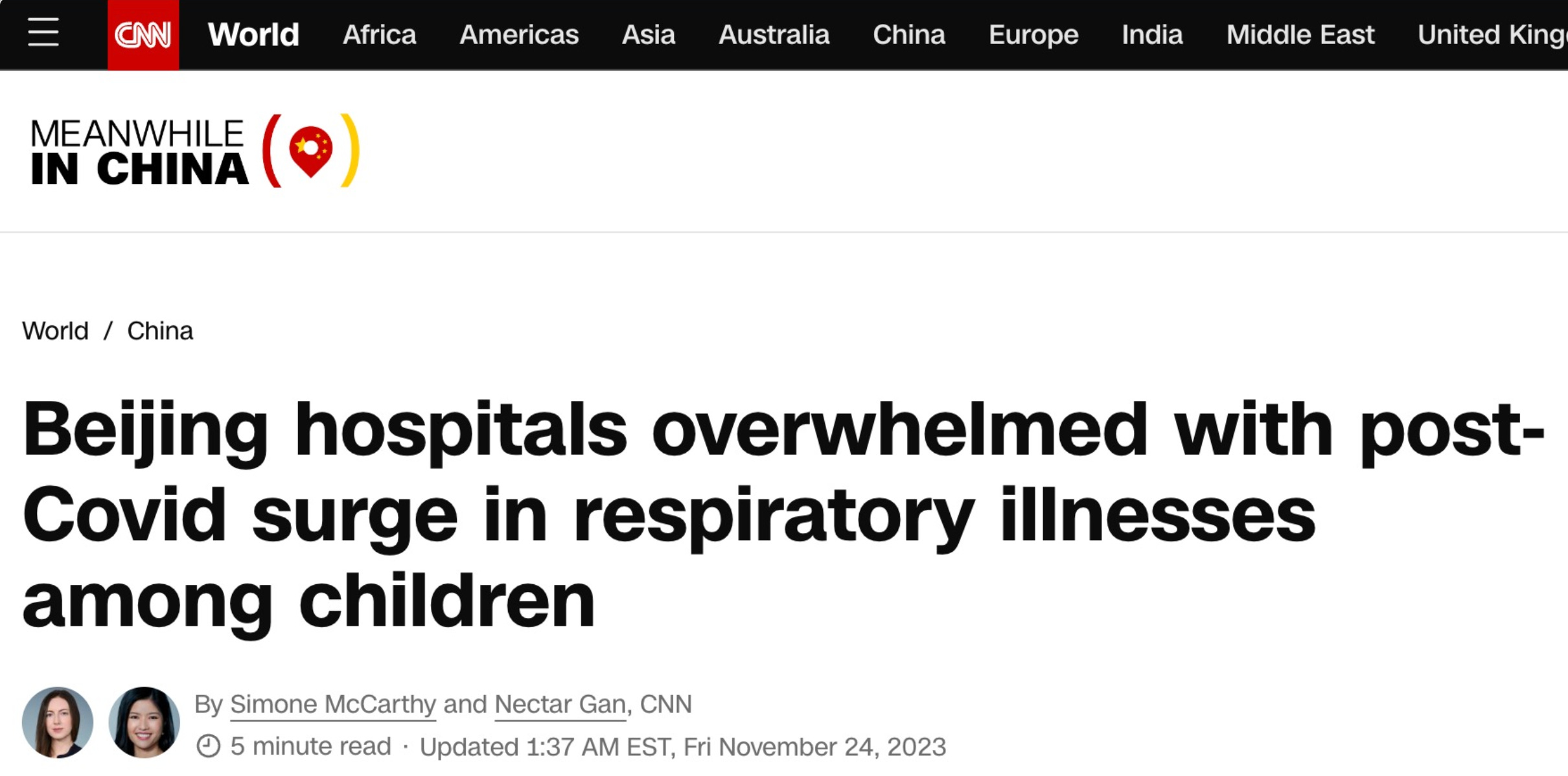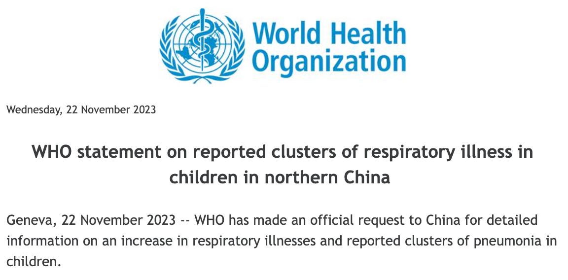 On Tuesday, 11 November 2023, the ProMED mail (Program for Monitoring Emerging Diseases) international early warning system, hosted and maintained by the International Society for Infectious Diseases, posted a machine translated report from FTV News (China) of an undiagnosed respiratory illness in several areas in China in the general regions of Beijing and Liaoning. As these two cities are almost 800 km apart, this information implies a widespread outbreak.