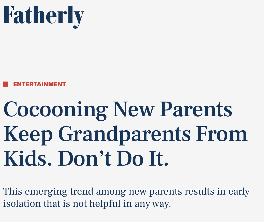 The impulse makes sense in the abstract. There would appear to be a lot of good reasons to cocoon. For one thing, isolation protects the baby from any rogue pathogens that visitors could carry in. For another thing — bonding! Also, everyone is tired and you’re not going to get out of your sweatpants or comb your hair for a couple of weeks. Finally, some grandparents are just too much, you know?