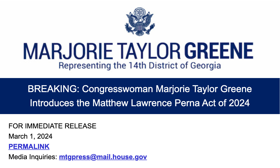 WASHINGTON D.C. — Today, Congresswoman Marjorie Taylor Greene is proudly introducing the Matthew Lawrence Perna Act of 2024, named in honor of Matthew Perna, a victim of the cruel and unusual treatment inflicted by Joe Biden’s Department of Injustice, tragically leading to his untimely death.