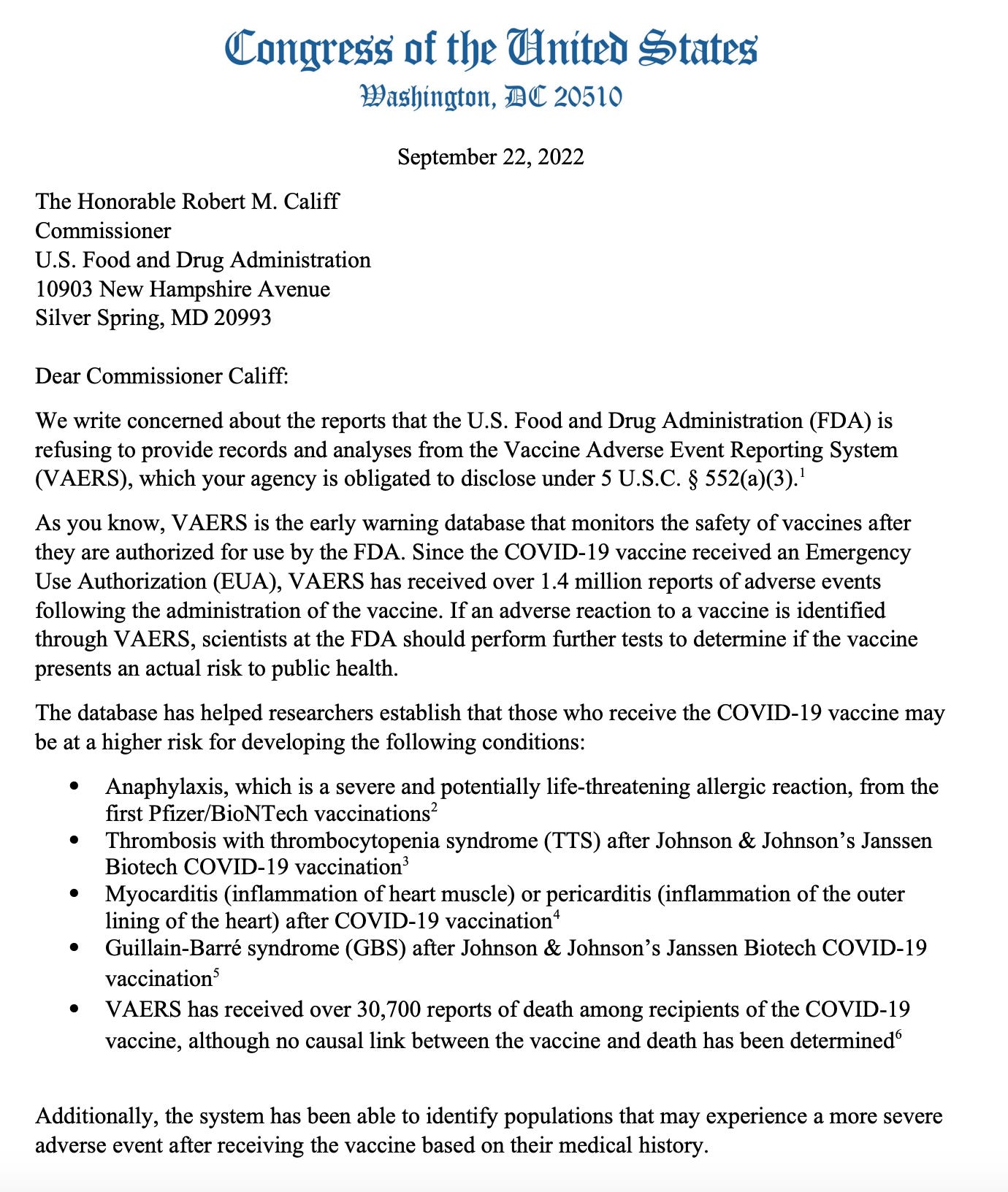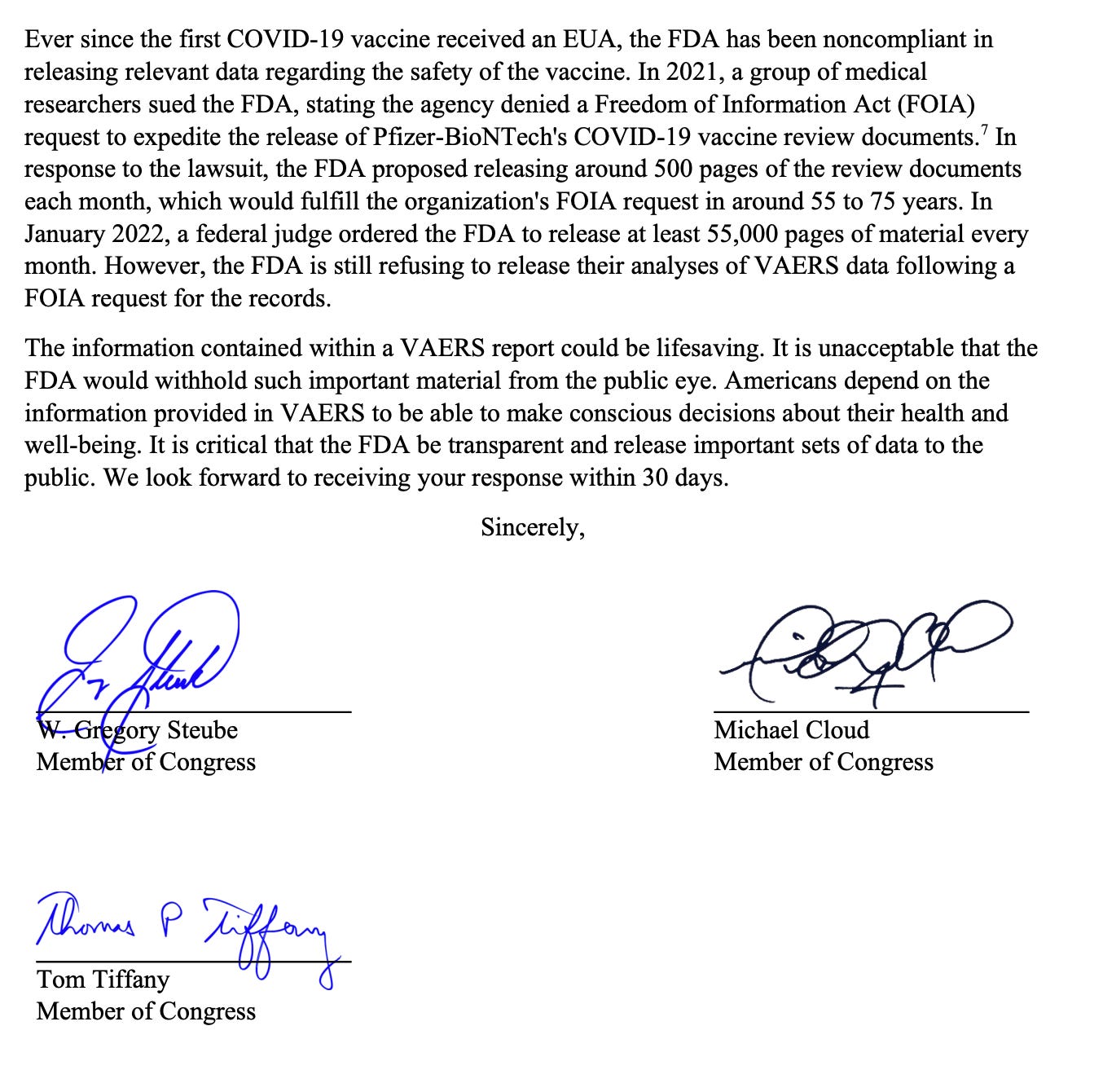 Greg Steube, a Republican U.S. Representative from Florida, sent the following letter to FDA Commissioner Robert M. Califf demanding full compliance with laws associated with the Vaccine Adverse Event Reporting (VAERS) data. In particular, the FDA has not released their analysis of the VAERS data ordered by a Federal judge January 2022. Two other members of Congress - Rep. Michael Cloud (R-Texas) and Rep. Tom Tiffany (R-Wis.) also signed the letter.