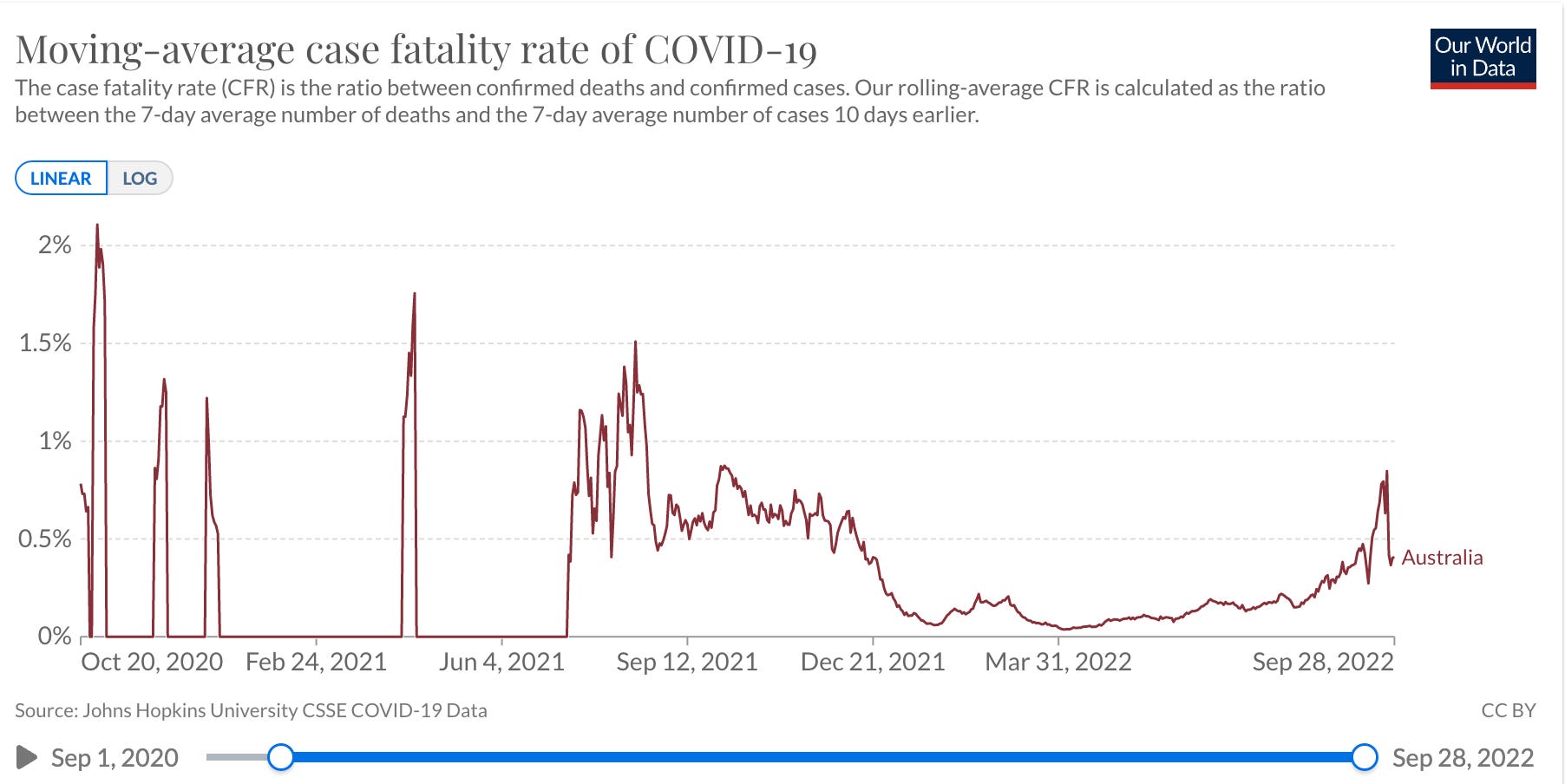 The case fatality rate in Australia - as of Sept 2022 is about one percent. This is an odd ratio and it has changed over time, as the method of counting cases has changed over time. At this point, this most likely represents deaths divided into those people presenting to a health care service. Most countries are no longer passively surveying COVID-19 cases and reporting on them in a rigorous way. The case fatality rate (death/cases presented) in other nations, irregardless of vaccine status currently sits between .05 and 1.5%. The more highly vaccinated nations seem to have no better or worse case fatality rates than those nations that didn’t highly vaccinate based on the Our World in Data website statistics.