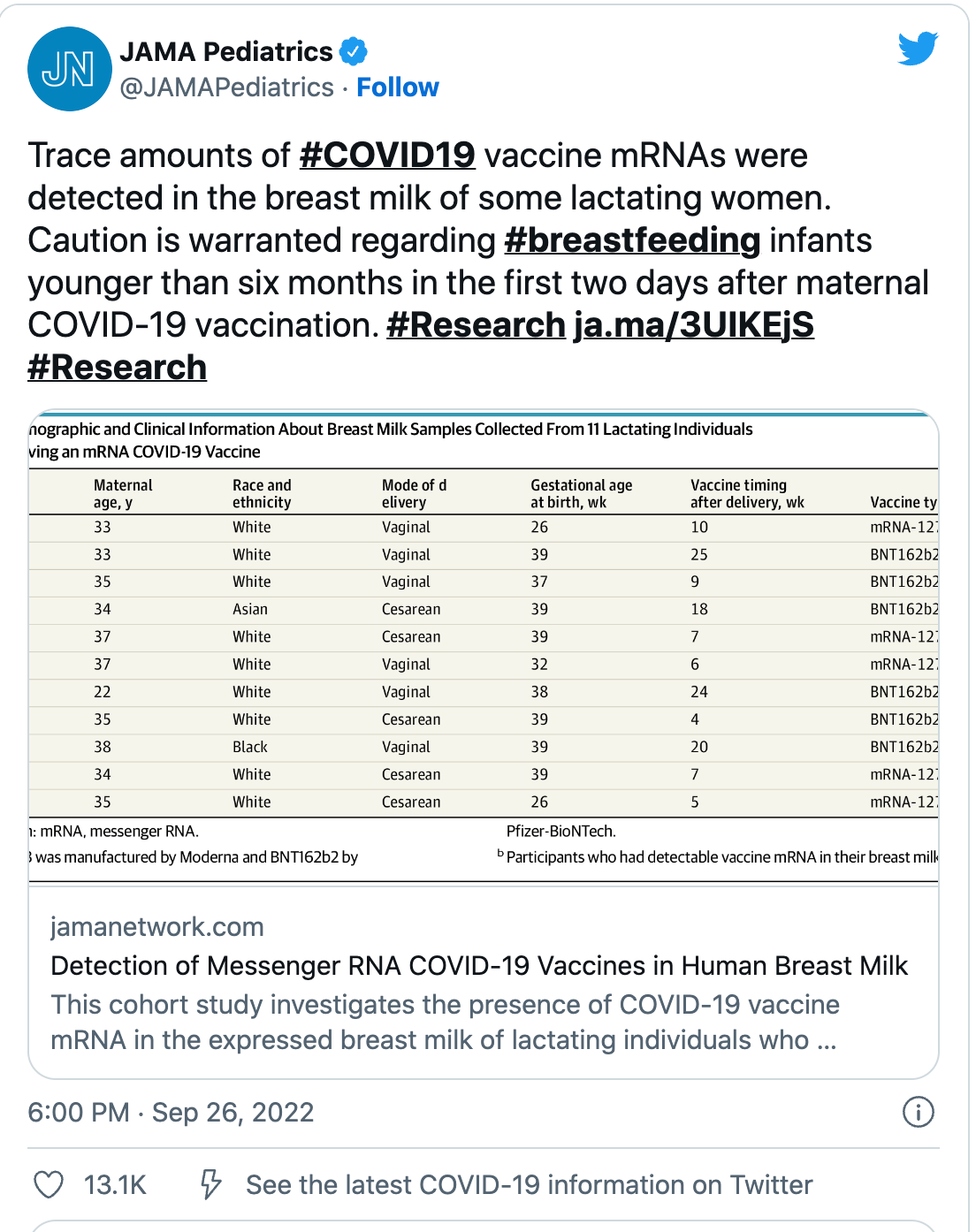 The University of California, San Francisco (UCSF) still has a “special notice” on their COVID-19 webpage that lactating mothers don’t have to worry about the vaccine showing up in breast milk. Do you think that “special notice” will come down now? How many lactating women received the vaccine without knowing that the mRNA would end up in her breast milk?