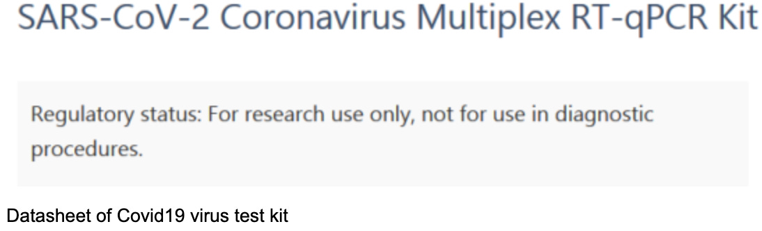A manufacturer of the Covid19 test kit states that it should only be used for research purposes and not for diagnostic applications, as it has not yet been clinically validated.