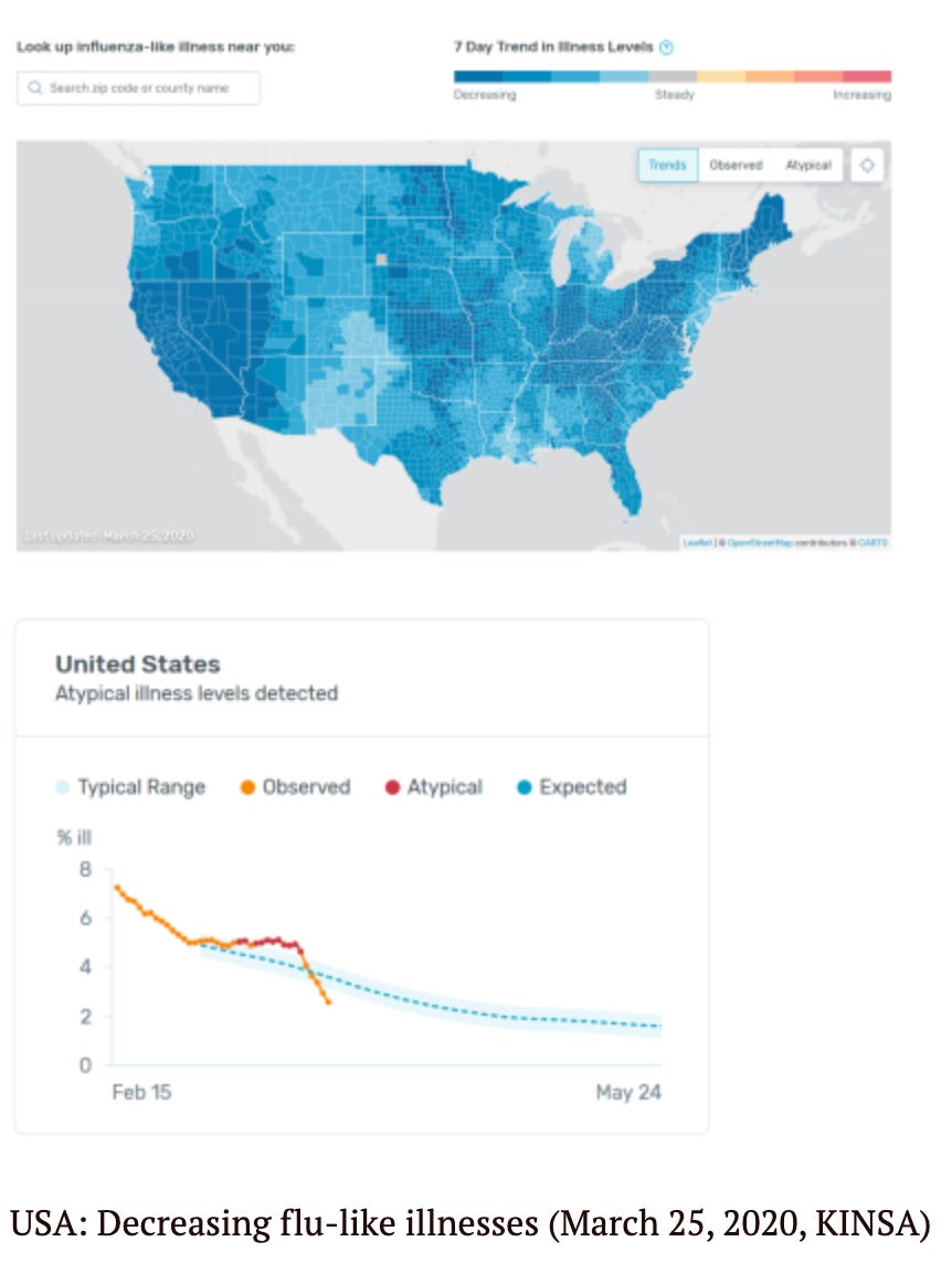 This immediately shows that during a flu season the positive rate rises from 0 to 10% to up to 80% of the samples and drops back to the normal value after a few weeks. In comparison, Covid19 tests show a constant positive rate in the normal range (see below).