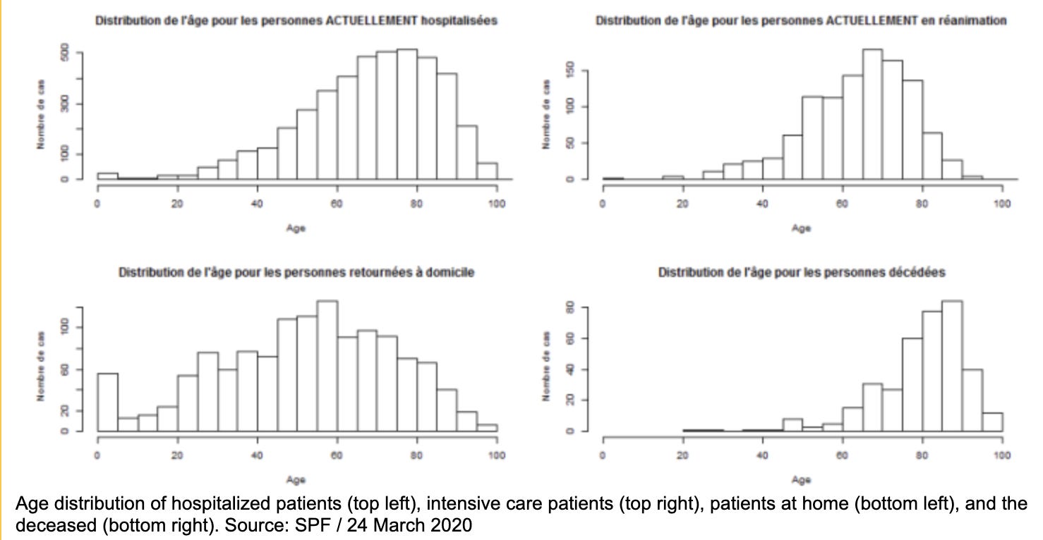 Age distribution of hospitalized patients (top left), intensive care patients (top right), patients at home (bottom left), and the deceased (bottom right). Source: SPF / 24 March 2020