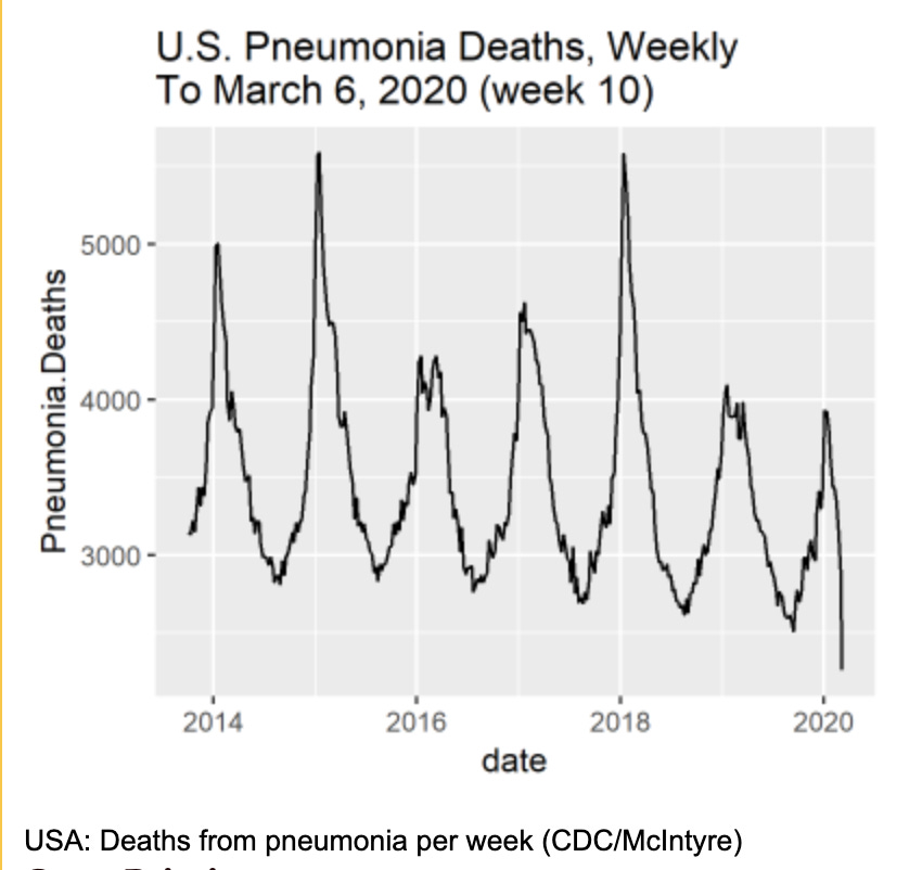USA: Researcher Stephen McIntyre has evaluated the official data on deaths from pneumonia in the US <tweet since deleted>. There are usually between 3000 and 5500 deaths per week and thus significantly more than the current figures for Covid19. The total number of deaths in the US is between 50,000 and 60,000 per week. (Note: In the graph below, the latest figures for March 2020 have not yet been fully updated, so the curve is slumping).