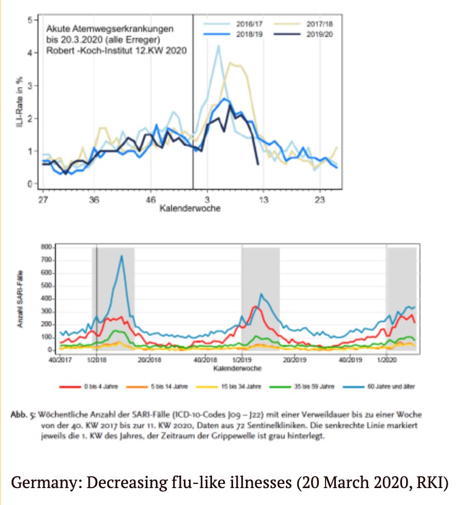In Italy the situation is now beginning to calm down. As far as is known, the temporarily increased mortality rates (65+) were rather local effects, often accompanied by mass panic and a breakdown in health care. A politician from northern Italy asks, for example, „how is it possible that Covid patients from Brescia are transported to Germany, while in the nearby Verona two thirds of intensive care beds are empty?“