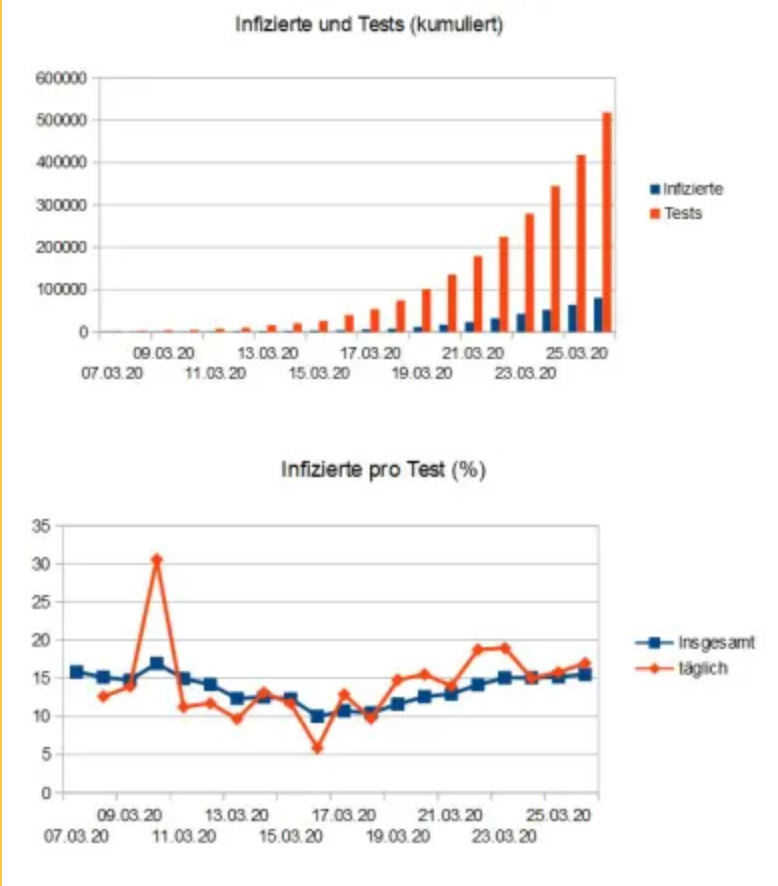 The latest data from the German Robert Koch Institute show that the increase in test-positive persons is proportional to the increase in the number of tests, i.e. in percentage terms it remains roughly the same. This may indicate that the increase in the number of cases is mainly due to an increase in the number of tests, and not due to an ongoing epidemic.