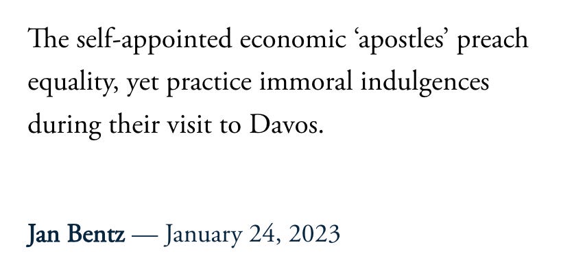 But maybe it is all those expensive call girls hanging about at Davos, that makes the WEF so elusive about that general attendee list. After all, the Demi-Gods of the world like to preach world equity, yet their appetite for high-end (and might I add immoral) indulgences are fully on display at their snowy playground in the Alps. No wonder Epstein liked Davos so much!