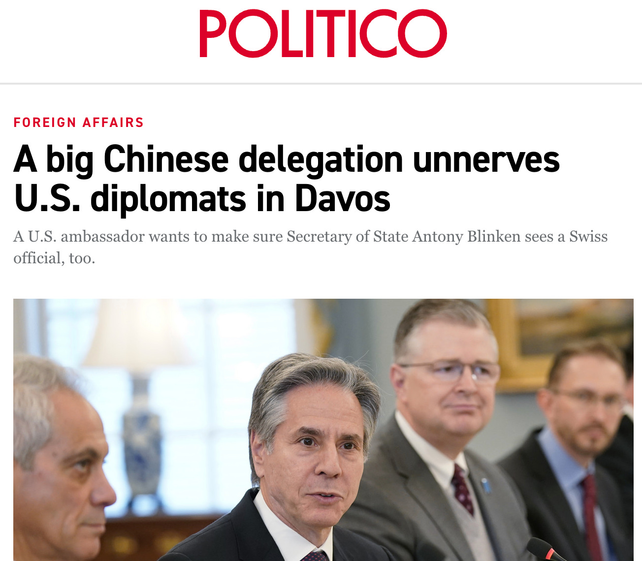 DAVOS, Switzerland — U.S. diplomats have been so worried about the size and intent of a Chinese delegation in Switzerland this week that they’re trying to arrange a meeting between Secretary of State Antony Blinken with a Swiss official while he’s in the country for the World Economic Forum.