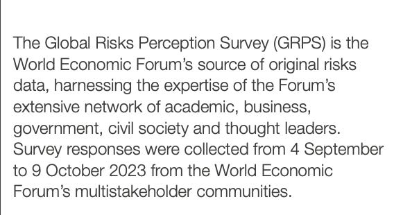 So, the WEF handpicks the risks and then asks their network of handpicked responders (WEF affiliated, wealthy, globalists) to rank them. No selection bias there <insert sarcasm>. This survey then gets picked up as the “real deal” by main-stream-corporate Mockingbird media outlets. Re-enforcing whatever narratives the WEF wants to push. Yeh, but it is all about “rebuilding trust”, right?