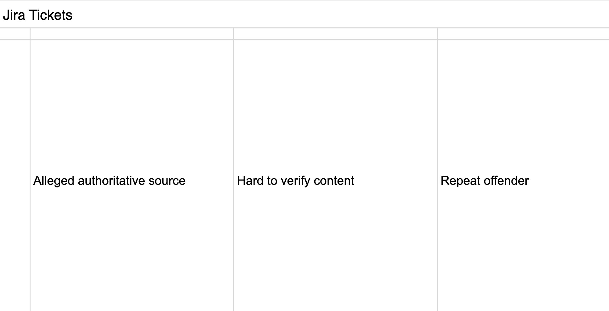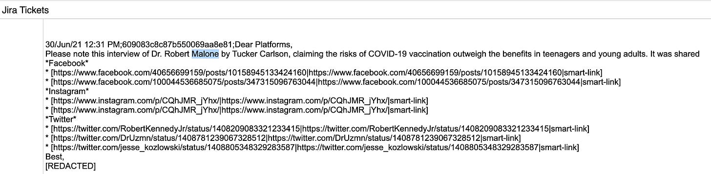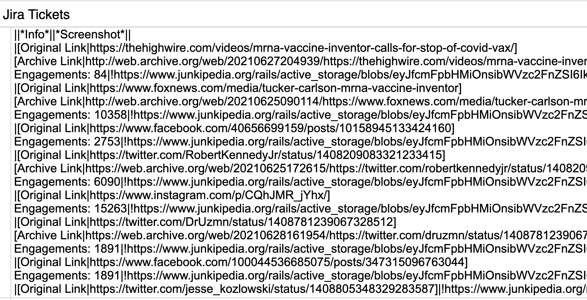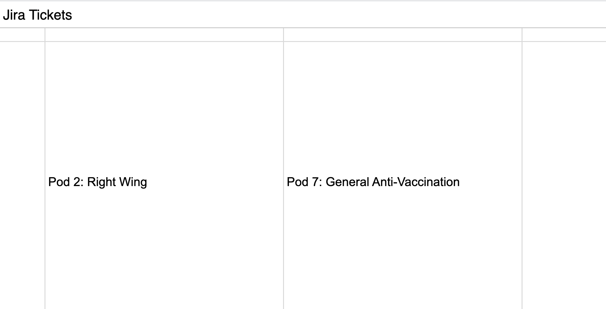 In the Jira Tickets list, it is worth noting that on 11 June 2021, the list abruptly changed its focus from “election misinformation” to “vaccine misinformation” and renamed these efforts as the virality project. Almost like there was some sort of directive from the top <sarcasm>.
