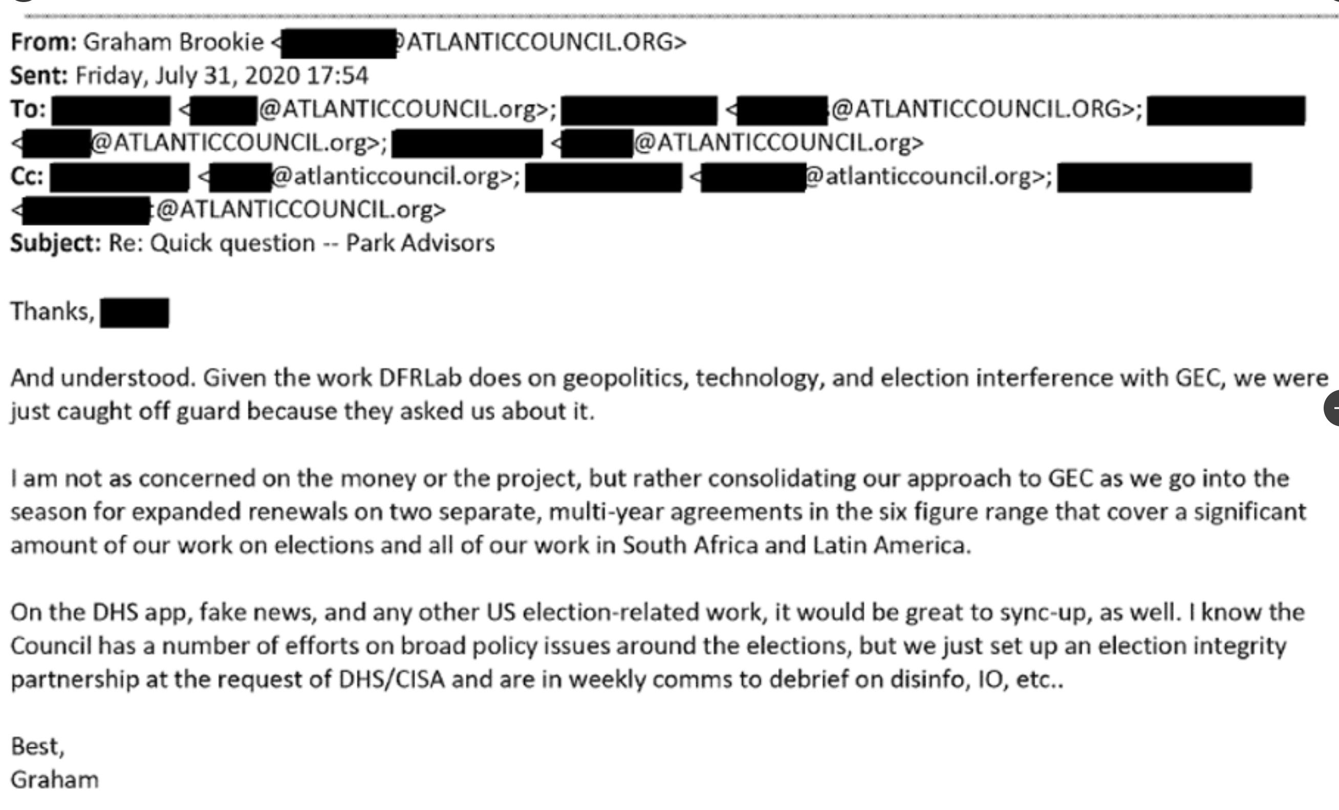 Representative Jim Jordan on his Twitter account also provided the receipts how the Election Integrity Partnership was founded, by attaching a letter from the Atlantic Council advising a “sync-up” whereby they created the Election Integrity Partnership in 2020. Ergo, a partnership of four organizations working in collaboration with both the US Government and the Atlantic Council.